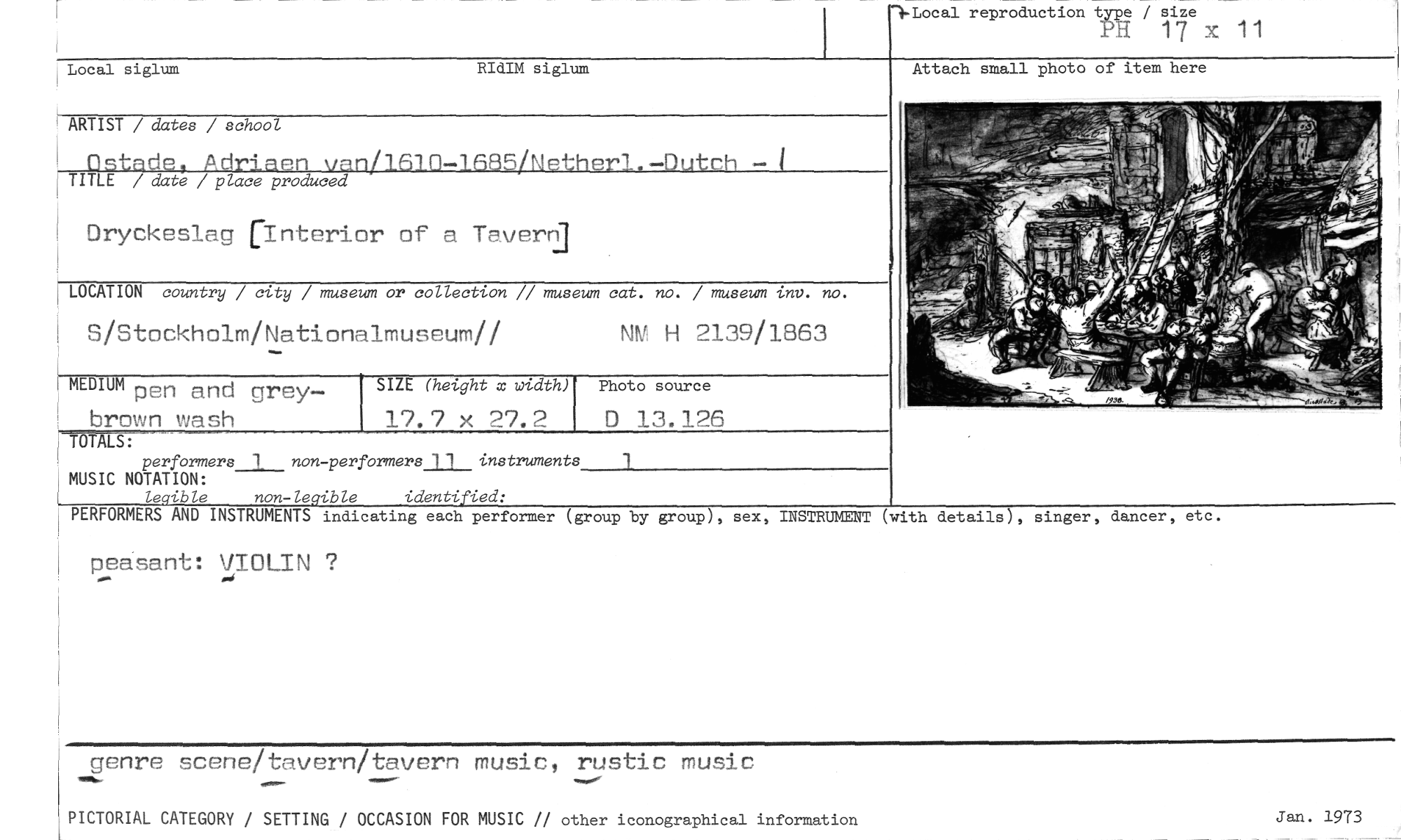//// —4-Local reproduction tfplf / size //// 17 x 11 //// Attach small photo of item here //// Local siglum RIdIM siglum //// ARTIST / dates / school //// Ostade, Adriaen van/161O-1685/Nether1.—Dutch —1 //// TITLE / date / place produced //// Dryckeslag [kriterier of a Tavern] //// LOCATION country / city / museum or collection // museum cat. no. / museum inv. no. //// 6/Stockholm/Nationalmuseum// NM H 2139/1863 //// MEDIUMpen and grey— //// SIZE (height x width) //// brown wash 17.7 x 27.2 //// Photo source //// D 13.126 //// rorm32-- //// perförmers 1 non-performers 11 instruments 1 //// MUSIC NOTATION: //// lectible non-legible identified: //// PERFORMERS AND INSTRUMENTS indicating each performer (group by group), sex, INSTRUMENT (with details), singer, dancer, etc. //// peasant: VIOLIN ? //// genre scene/tavern/tavern music, rustic music //// PICTORIAL CATEGORY / SETTING / OCCASION FOR MUSIC // other iconographical information //// Jan. 1973 ////