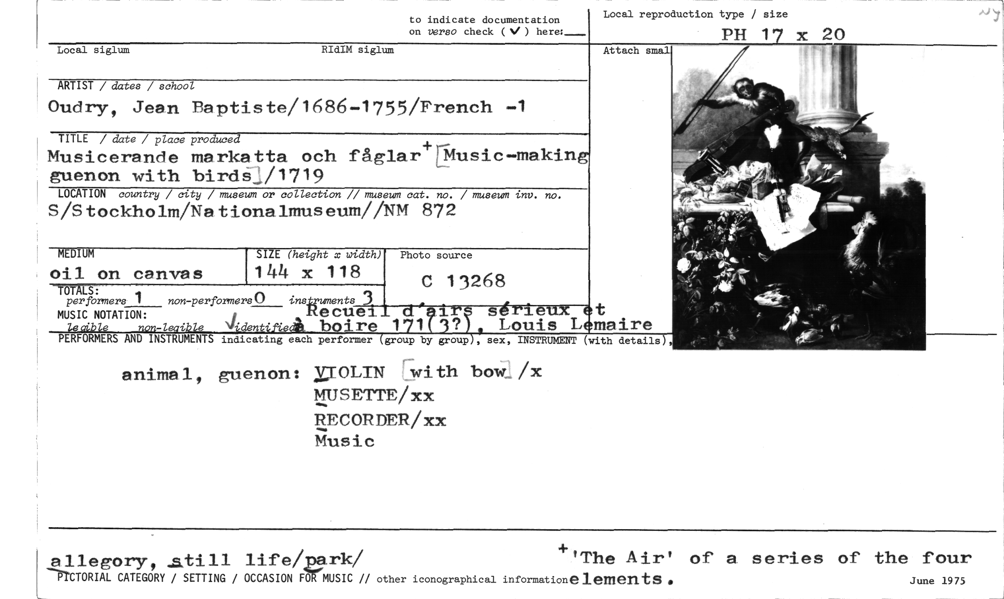 //// animal, guenon: /LOLIN with bow3x //// MUSETTE/xx //// RECORDER/ xx //// Music //// allegory, life/A.rk/ +.'The Air' of a. series of the four //// 'TCTORIAL CATEGORY / SETTING / OCCASION Fa-MUSIC // other iconographical informationelements • June 1975 //// PERFORMERS AND INSTRUMENTS indicating each performer //// group by group sex, INSTRUMENT (with details //// to indicate documentation //// on versa check ( V ) here:___ //// Local reproduction type / size //// PH 1 x 20 //// Attach smal //// ARTIST / dates / school //// Oudry, Jean Baptiste/1686-1755/French -1 //// TITLE / date / place produced //// Musicerande markatta och fåglar LMusic-making guenon with birdaL/1719 //// LOCATION country / city / museum or collection // museum cat. no. / museum inv. no. //// S/Stockholm/Nationalmuseum//NM 872 //// SIZE (hetyht x width) //// 144 x 118 //// non-perfbrmers() instruments 3 //// Recuei //// -/ i Abden bo're //// MEDIUM //// oil on canvas //// TOTALS: //// per formers 1 //// MUSIC NOTATION: //// Local siglum RIdIM siglum ////