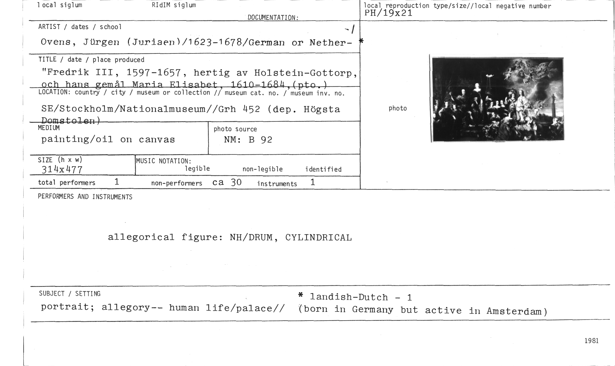 //// local siglum RId M siglum //// DOCUMENTATION: //// local reproduction type/size//local negative number //// PH/19x21 //// ARTIST / dates / school //// Ovens, Jilrgen (Juriaen)/1623-1678/German or Nether- * //// TITLE / date / place produced //// "Fredrik III, 1597-1657, hertig av Holstein-Gottorp, //// och hans um21 Maria F1is2bPt, 1610-1684,(pto.) //// LOCATION: country / city / museum or collection // museum cat. no. / museum inv. no. //// SE/Stockholm/Nationalmuseum//Grh 452 (dep. Högsta //// Domstolen) //// MEDIUM photo source //// painting/oil on canvas NM: B 92 //// photo //// SIZE (h x w) //// 314x477 //// MUSIC NOTATION: //// legible non-legible identified //// total performers 1 non-performers ca 30 instruments 1 //// PERFORMERS AND INSTRUMENTS //// allegorical figure: NH/DRUM, CYLINDRICAL //// SUBJECT / SETTING * landish-Dutch - 1 //// portrait; allegory-- human life/palace// (porn in Germany but active in Amsterdam) //// 1981 ////