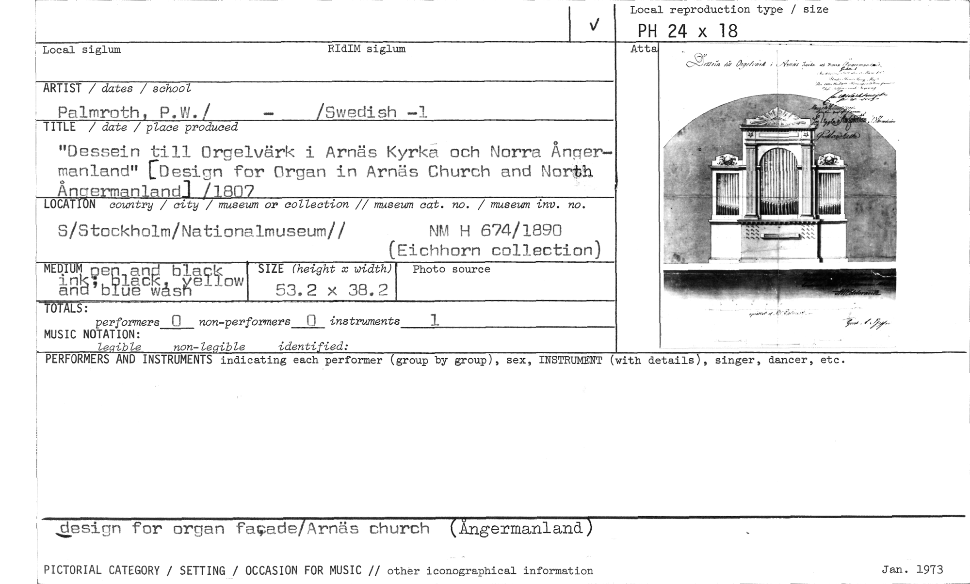 //// E //// Local reproduction type / size //// PH 24 x 18 //// Local siglum RIdIM siglum //// ARTIST / dates / school //// Palmroth, P.W./ /Swedish —1 //// TITLE / date / place produced //// "Dessein till Orgelvärk i Arnäs Kyrka och Norra Ångermanland" [Design for Organ in Arnäs Church and North Ångermanland] /1807 //// LOCATION country / city / museum or collection // museum cat. no. / museum inv. no. //// S/Stockholm/Nationalmuseum// NM H 674/1890 //// (Eichhorn collection) //// hullumQe ang blaQ ink, lac ve.Äow ana biiue wasn //// -1-53MES: //// perförmere 0 non -perförmers 0 instruments 1 //// MUSIC NOTATION: //// legible non-legible identified: //// PERFORMERS AND INSTRUMENTS indicating each performer (group by group), sex, INSTRUMENT //// singer, dancer, etc. //// SIZE (height x width) //// 53.2 x 38.2 //// Photo source //// (with details), //// design for organ fa4ade/Arnäs church (Ångermanland) //// LPICTORIAL CATEGORY / SETTING / OCCASION FOR MUSIC // other iconographical information //// Jan. 1973 ////