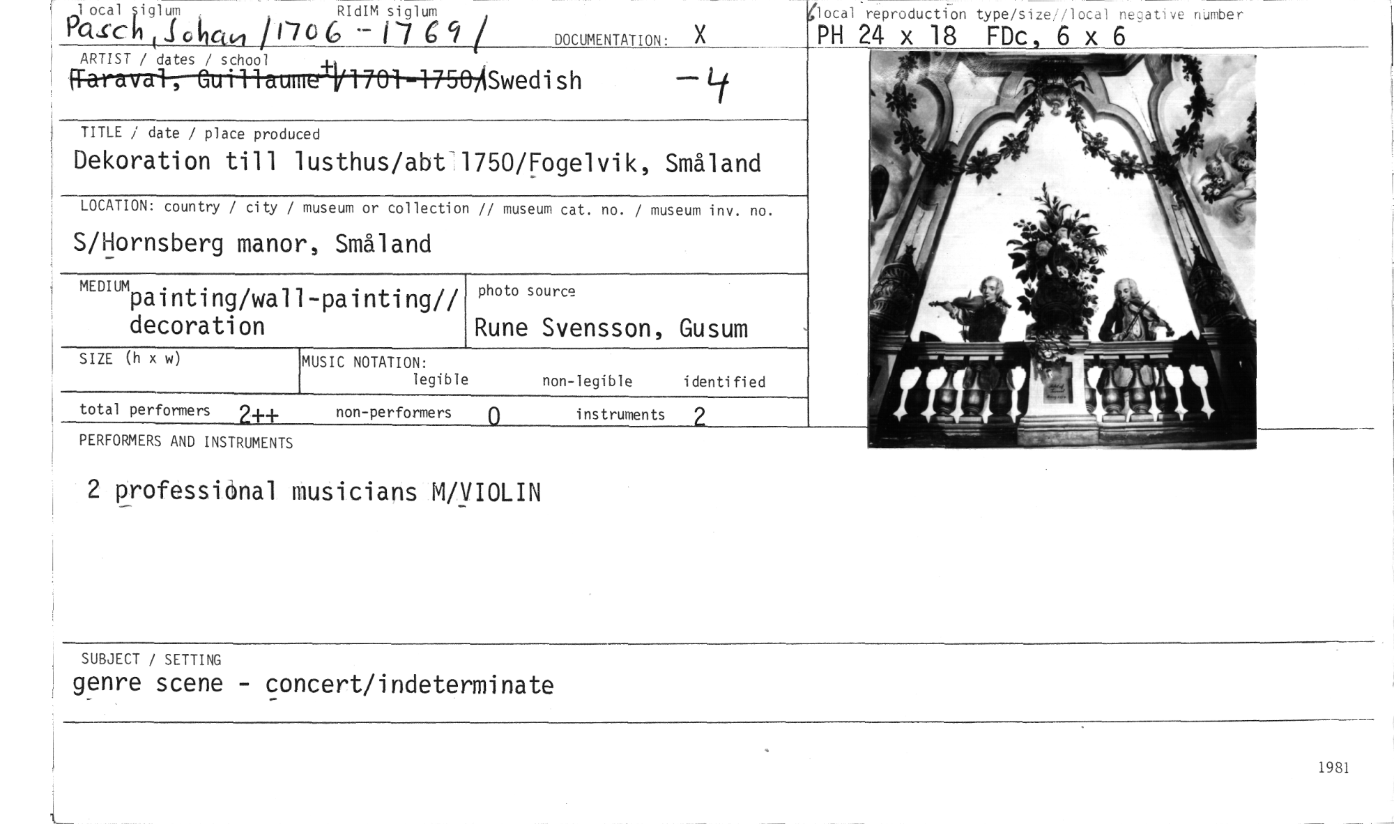//// SUBJECT / SETTING //// genre scene - concert/indeterminate //// lotal reproduction type/size //// lov nurober //// MEDIUM //// nting/wall-painting// decoration //// Rune Svensson, Gusum //// photo source //// 1 ocalsiglum , RIdIM siglum //// Pcrch(okcu,, i I-706 — II c 9/ DOCUMENTATION: //// ARTIST / dates / school //// .• y • . N " Swedish //// j TITLE / date / place produced //// Dekoration till lusthus/abt-1750/Fogelvik, Småland //// LOCATION: country / city / museum or collection // museum cat. no. / museum inv. no. //// S/Hornsberg manor, Småland //// PH 24 x 18 FDc, //// SIZE (h x w) //// total performers //// PERFORMERS AND INSTRUMENTS //// MUSIC NOTATION: //// legible //// non-legible identified //// non-performers j instruments //// 2 professiönal musicians M/VIOLIN //// x //// L ////