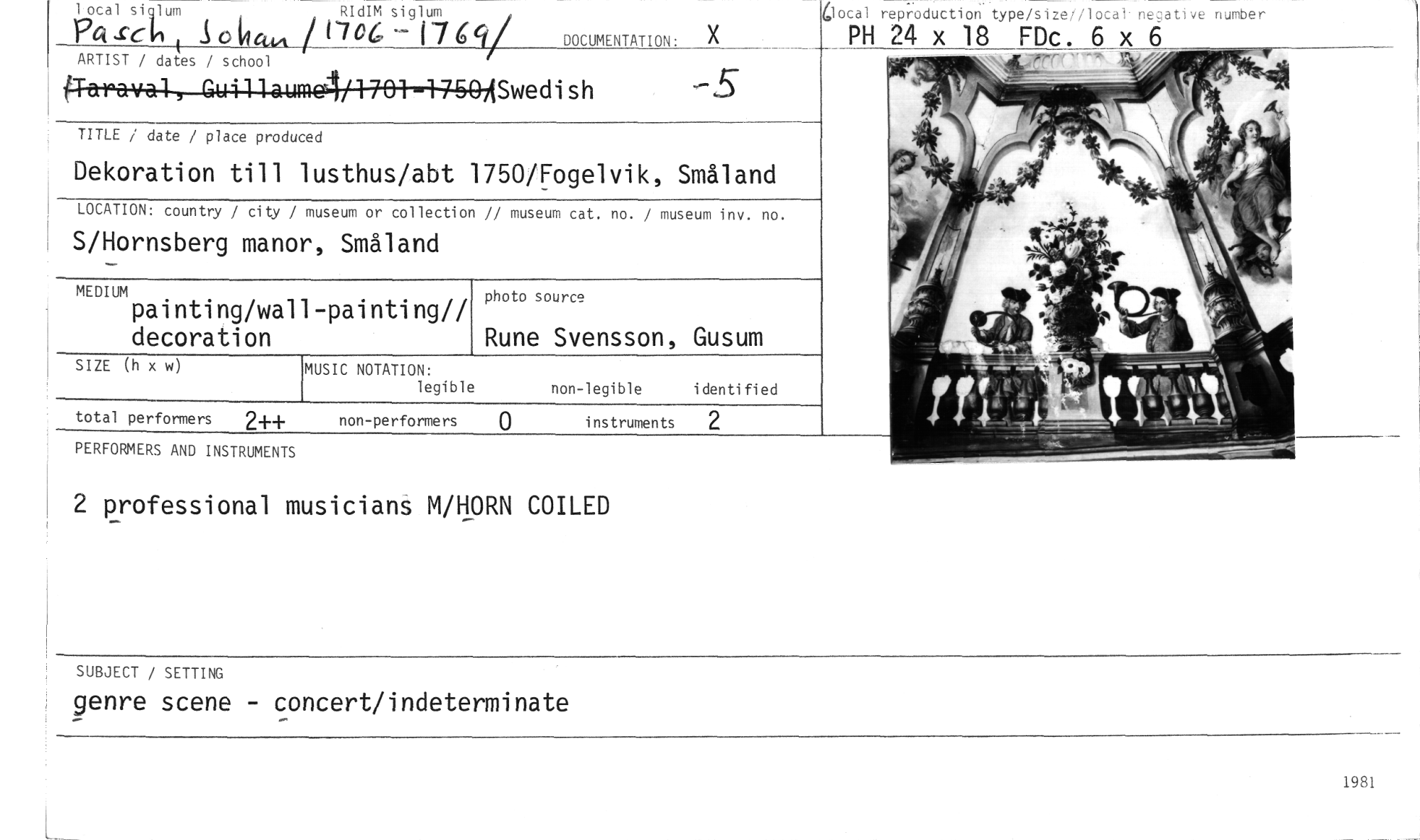 //// Pet sc-11 o / 1104 - 17 Cg //// 1 otal siglum RIdIM siglum //// DOCUMENTATION • X //// ARTIST / dates / school //// TITLE / date / place produced //// Dekoration till lusthus/abt 1750/Fogelvik, Småland //// LOCATION: country / city / museum or collection // museum cat. no. / museum inv. no. //// S/Hornsberg manor, Småland //// MEDIUM //// painting/wall -painting// decoration //// SIZE (h x w) //// non-legible identified //// total performers 2++ non-performers //// PERFORMERS AND INSTRUMENTS //// `lotal reproduction type/size//local ne e number //// PH 24 x 18 FDc. 6 x //// Swedish —5 //// MUSIC NOTATION: //// legible //// photo source //// Rune Svensson, Gusum //// 0 //// instruments 2 //// 2 professional musicians M/HORN COILED //// SUBJECT / SETTING //// genre scene - concert/indeterminate //// 199:1 ////