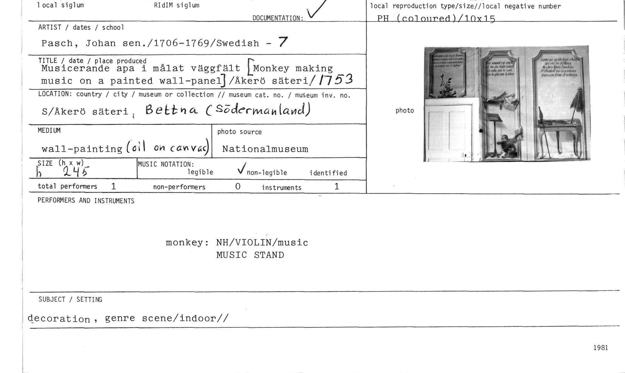 //// 1 ocal siglum RIdIM siglum //// DOCUMENTATION. //// local reproduction type/size//local negative number PH (enloured)/10x15 //// ARTIST / dates / school //// Pasch, Johan sen./1706-1769/Swedish — /7 //// TITLE / date / place produced //// Musicerande apa i målat väggfält [Monkey making music on a painted wall-panel]/Akerö säteri//7,53 //// LOCATION: country / city / museum or collection // museum cat. no. / museum inv. no. //// S/Akerö säteri t BeLth a C Söderkvtak lavtd) //// photo source //// Nationalmuseum //// SIZE (h x w) //// Q.)-1 C //// total performers 1 non-performers 0 instruments 1 //// MEDIUM //// wall-painting (0i I om catIvac) //// MUSIC NOTATION: //// ( //// legible NInon-legible identified //// photo //// PERFORMERS AND INSTRUMENTS //// monkey: NH/VIOLIN/music MUSIC STAND //// SUBJECT / SETTING scene/indoor// //// decoration, genre //// 1981 ////
