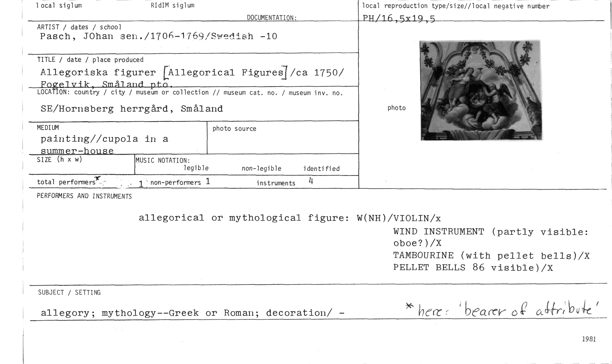//// 1 ocal siglum RIdIM siglum //// DOCUMENTATION: //// local reproduction type/size//local negative number //// PI.T/1 6 5y1 9 5 //// ARTIST / dates / school //// Pasch, JOhan sen./1706-1769/5dish -10 //// TITLE / date / place produced //// Allegoriska figurer [Allegorical Figureg/ca 1750/ //// Fngelvik, Småland pfn LOCATION: country / city / museum or collection // museum cat. no. / museum inv. no. //// SE/Hornsberg herrgård, Småland //// MEDIUM photo source //// painting//cupola in a summer-house //// SIZE (h x w) MUSIC NOTATION: i denti fied //// legible non-legible //// total performers 1 non-performers 1 instruments 4 //// PERFORMERS AND INSTRUMENTS allegorical or mythological figure: //// photo //// W(NH)/VIOLIN/x //// WIND INSTRUMENT (partly visible: oboe?)/X //// TAMBOURINE (with pellet bells)/X PELLET BELLS 86 visible)/X //// SUBJECT / SETTING //// allegory; mythology--Greek or Roman; decoration/ - betr bearer g akr; uic //// 1981 ////