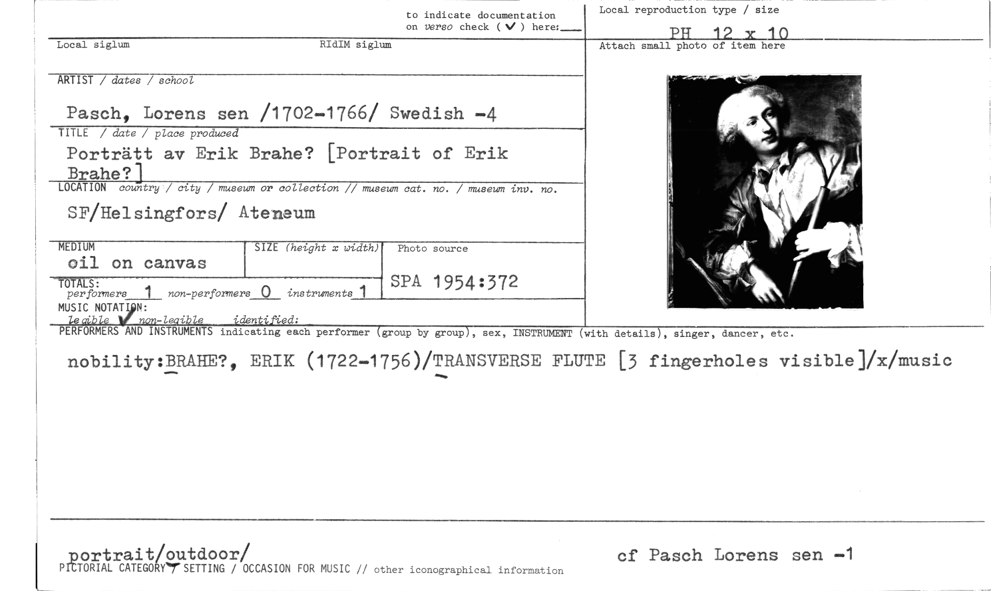 //// to indicate documentation //// on verso check ( ) here:_ //// Local reproduction type / size //// PR 12 y 10 //// Local siglum RIdIM siglum //// Attach small photo of item here //// ARTIST / dates / school //// Pasch, Lorens sen /1702-1766/ Swedish -4 //// TITLE / date / place produced //// Porträtt av Erik Brahe? [Portrait of Erik Brahe?] //// LOCATION country / city / museum or collection // museum cat. no. / museum ini,. no. //// SF/Helsingfors/ Ateneum //// SIZE (height x width) //// TÖTAUS: //// per formers 1 non-performers 0 instruments 1 //// MUSIC NOTATION: //// lecible non-leqible identified: //// PERFORMERS AND INSTRUMENTS indicating each performer (group by group), sex, INSTRUMENT (with details), singer, dancer, etc. //// nobility:BRAHE?, ERIK (1722-1756)/TRANSVERSE FLUTE [3 fingerholes visible]/x/music //// MEDIUM //// oil on canvas //// Photo source //// SPA 1954:372 //// portrait/outdoor/ //// PICTORIAL CATEGORY'rSETTING / OCCASION FOR MUSIC // other iconographical information //// cf Pasch Lorens sen —1 ////