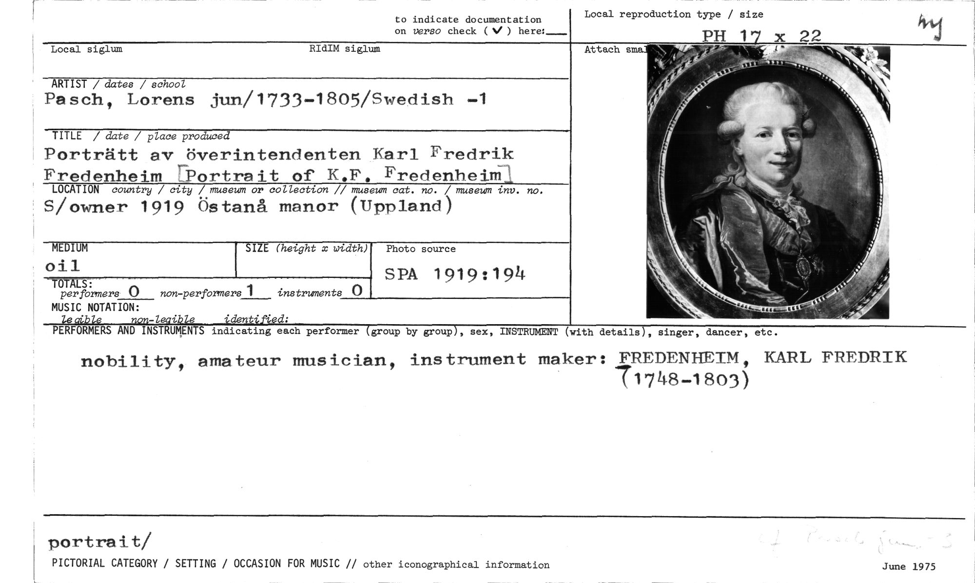 //// to indicate documentation //// on verso check ( ) heret__—_ //// Local reproduction type / size //// PH 17 x 22 //// Attach sma //// Local siglum RIdIM siglum //// ARTIST / dates / school //// Pasch, Lorens jun/1733-1805/Swedish -1 //// TITLE / date / place produced //// Porträtt av överintendenten Karl Fredrik //// Fredenheim 7Portrait of K.F. Fredenheim, //// LOCATION country / city / museum or collection // museum cat. no. / museum inv. no. //// S/owner 1919 Östanå manor (Uppland) //// MEDIUM SIZE (height x mr.dth) //// 0 //// performers 0 non-performers 1 instruments () //// MUSIC NOTATION: //// lec4ble non-leaible identifi?d: //// PERFORMERS AND INSTRUMENTS indicating each performer (group by group), sex, INSTRUMENT (with details), singer, dancer, etc. //// nobility, amateur musician, instrument maker: FREDENHEIM, KARL FREDRIK //// 71748-1803) //// SPA 1919:194 //// Photo source //// portrait/ //// PICTORIAL CATEGORY / SETTING / OCCASION FOR MUSIC // other iconographical information //// June 1975 ////