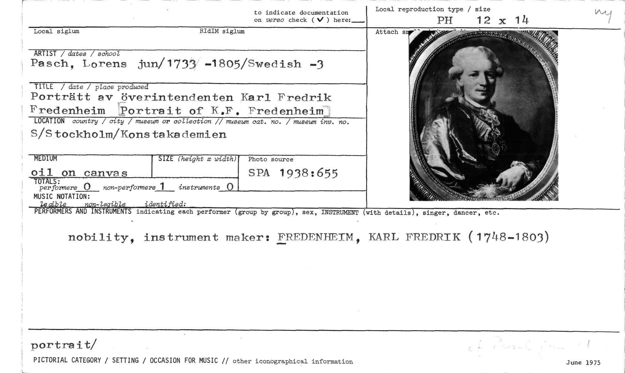 //// Local reproduction type / size //// PH 12 x 14 //// to indicate documentation on verso check ( ) here: //// Local siglum RIdIM siglum //// ARTIST / dates / school //// Pasch, Lorens jun/173J/-1805/Swedish -3 //// TITLE / date / place produced //// Porträtt av överintendenten Karl Fredrik Fredenheim 5ortrait of K.F. FredenheiM3 //// LOCATION country / city / museum or collection // museum cat. no. / museum inv. no. //// S/Stockholm/Konstakademien //// MEDIUM SIZE (height x width) Photo source //// oil on canvas SPÄ 1938:655 //// -TOTALS: //// per formers 0 non-perfbrmers 1 instruments 0 //// MUSIC NOTATION: //// ndicating (group by group), sex, INSTRUMENT (with details), singer, dancer, etc. //// nobility, instrument makor: FREDENHEIM, KARL FREDRIK (1748-1803) //// port ra it! //// PICTORIAL CATEGORY / SETTING / OCCASION FOR MUSIC // other iconographical information //// June 1975 ////