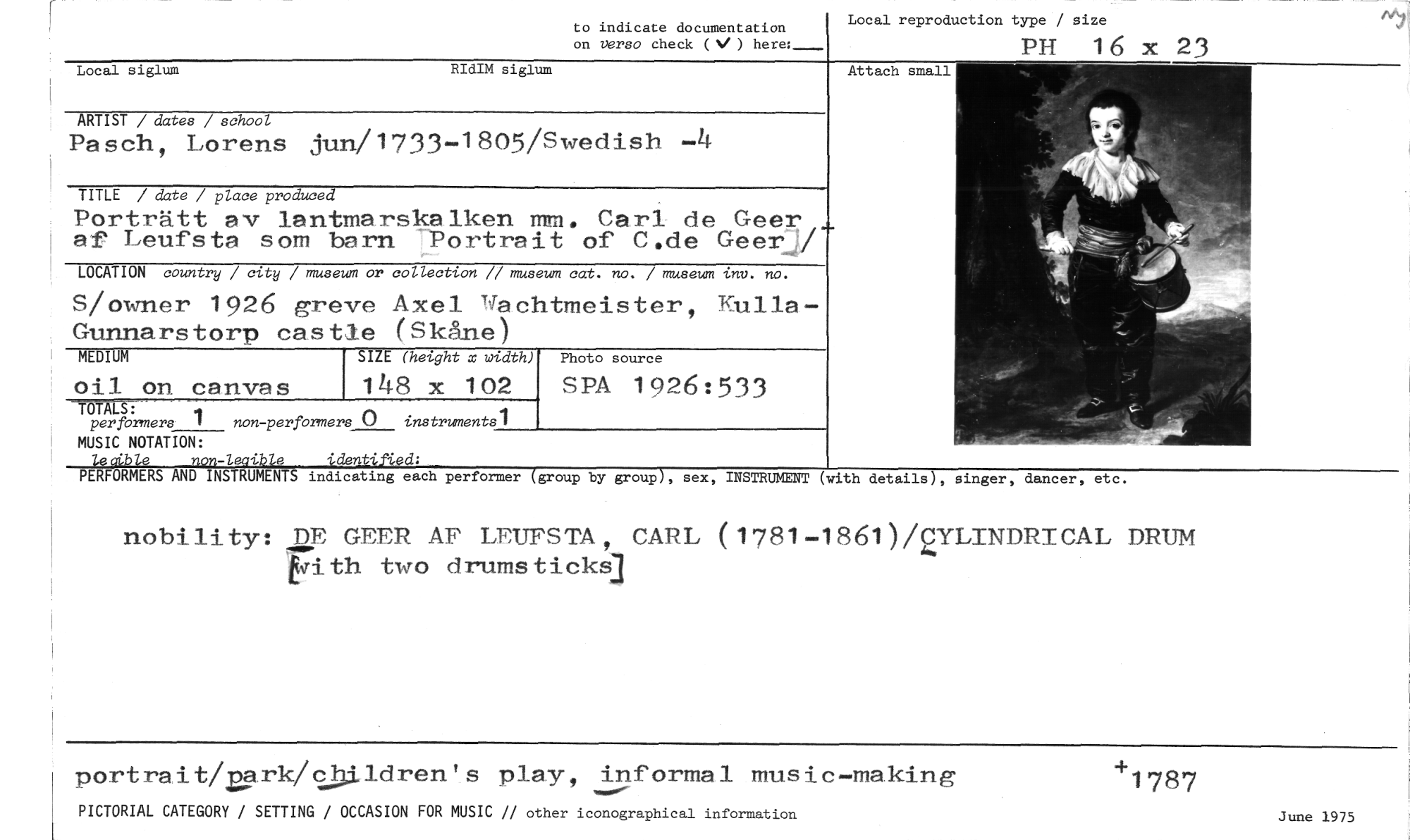 //// Local reproduction type / size //// PH 16 x 23 //// Local siglum RIdIM siglum //// ARTIST / datee / school //// Pasch, Lorens jun/1733-1805/Swedish -4 //// TITLE / date / place produced //// Porträtt av lantmarskalken mm. Carl de Geer, //// af Leufsta som barn Portrait of C.de Geer/ //// LOCATION country / city / museum or collection // museum cat. no. / museum /ny. no. //// S/owner 1926 greve Axel Wachtmeister, Kulla - Gunnarstorp castle (Skåne) //// MEDIUM canvas SIZE (height x width) Photo source //// oil on 148 x 102 SPA 1926:533 //// -TÖM: 1 non-performers () instruments.' //// per formers //// MUSIC NOTATION: //// leaible non-leaible identificd: //// PERFORMERS AND INSTRUMENTS indicating each performer (group by group), sex, INSTRUMENT (with details), //// nobility: DE GEER AF LEUFSTA, CARL (1781-1861)/2YLINDRICAL DRUM blith two drumsticks] //// to indicate documentation //// on verso check ( ) here:__ //// Attach small //// singer, dancer, etc. //// portrait/u.ark/z,hi.ldren's play, informat music-making //// PICTORIAL CATEGORY / SETTING / OCCASION FOR MUSIC // other iconographical information //// +1787 //// June 1975 ////
