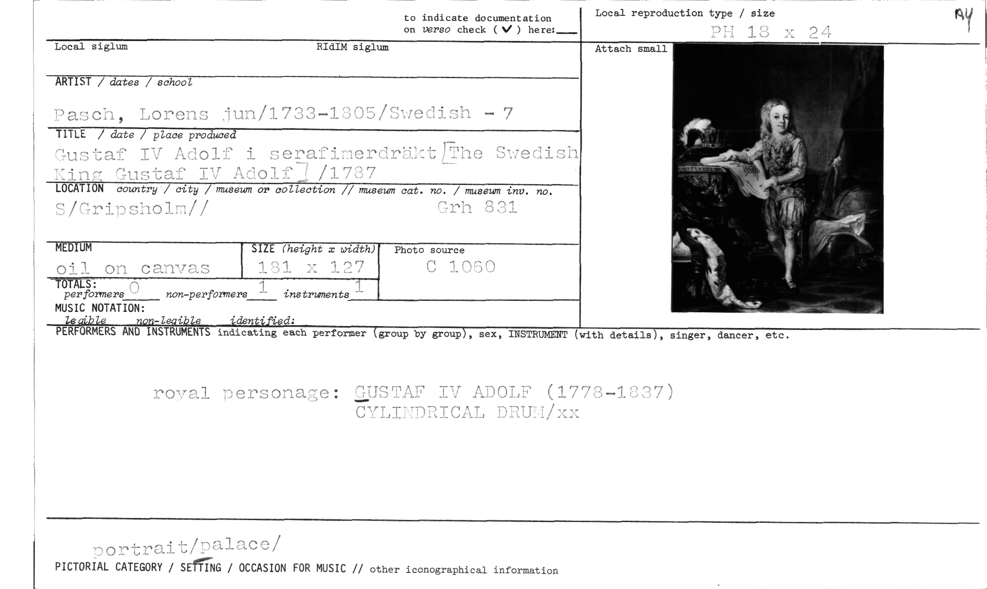 //// to indicate documentation //// on verso check (V ) heres___ //// Local reproduction type / size //// PH 18 x //// Local siglum RIdIM siglum //// ARTIST / datea / school //// Pasch Lorens jun/1733-1805/Swedish - 7 //// TITLE / date / place produced //// Gustaf IV Adolf i serafinerdräkt El"he Swedish Gustaf IV Adolf /1737 //// LOCATION country'/ city / museum or collection // museum cat. no. / museum inv. no. //// S/GriDsholm// Grh 831 //// Photo source //// C 1060 //// roval personage: GUSTAF IV ADOLF (1778-1837) CYLINDRICAL DRUM/xx //// Attach small //// MEDIUM //// oil on canvas =EM-- //// 0 //// SIZE (height x width) x 181 127 //// per formers non-performers å instruments //// MUSIC NOTATION: //// Uppible nop-leaible identified: //// PERFORMERS AND INSTRUMENTS indicating each performer (group by group), sex, INSTRUMENT (with detaila), singer, dancer, etc. //// nO"trait/PalaCei //// PICTORIAL CATEGORY / SETTING / OCCASION FOR MUSIC // other iconographical information ////