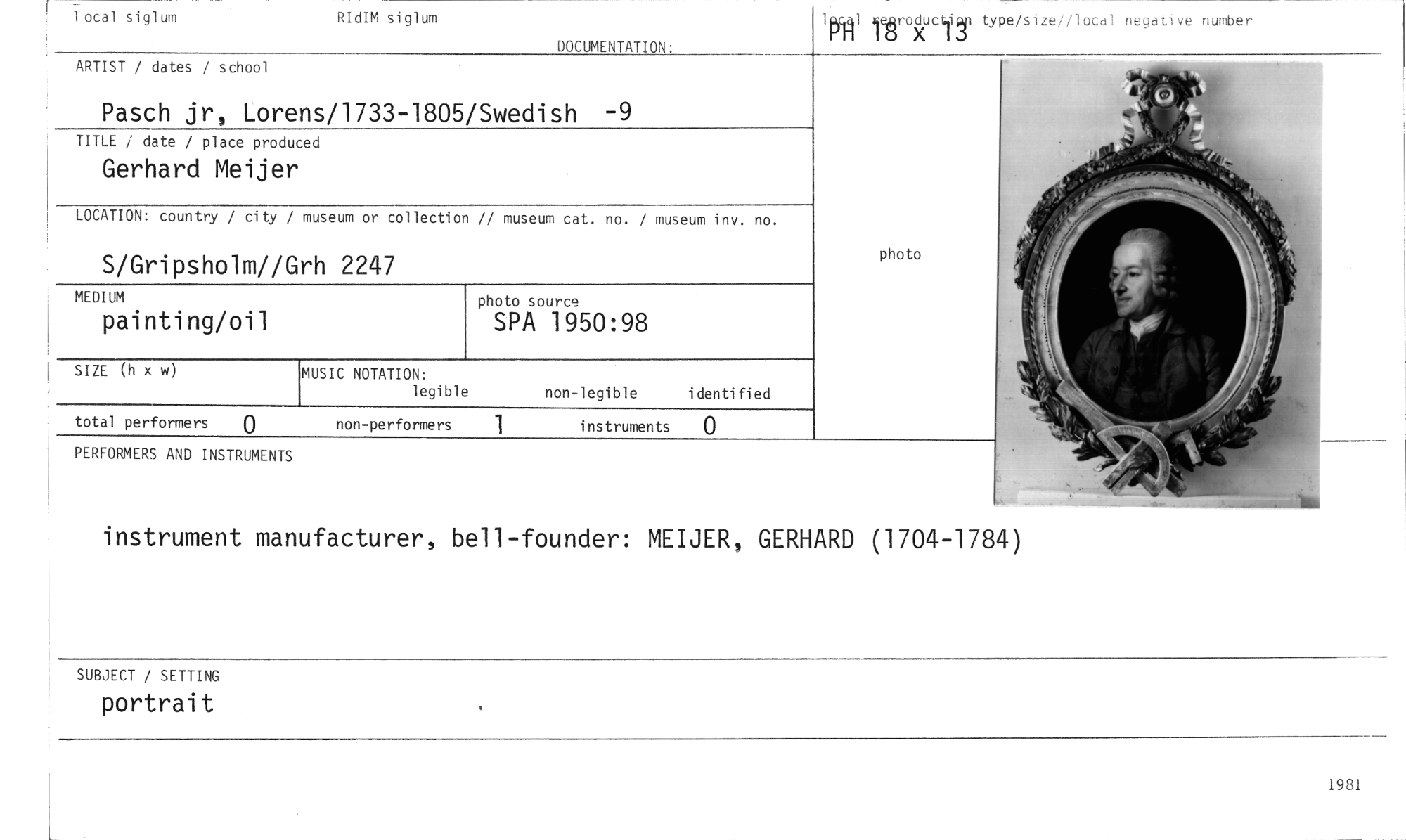 //// instrument manufacturer, bell-founder: MEIJER, GERHARD (1704-1784) //// SUBJECT / SETTING //// portrait //// 1981 //// MEDIUM //// painting/oil //// photo source //// SPA 1950:98 //// 0 //// total performers //// I local siglum RIdIM siglum //// DOCUMENTATION: //// 10411 itrok,cLil type/size//local negative number //// ARTIST / dates / school //// Pasch jr, Lorens/1733-1805/Swedish - //// TITLE / date / place produced //// Gerhard Meijer //// LOCATION: country / city / museum or collection // museum cat. no. / museum inv. no. //// S/Gripsholm//Grh 2247 //// SIZE (h x w) //// MUSIC NOTATION: //// legible //// non-performers //// non-legible identified //// instruments 0 //// PERFORMERS AND INSTRUMENTS //// photo ////