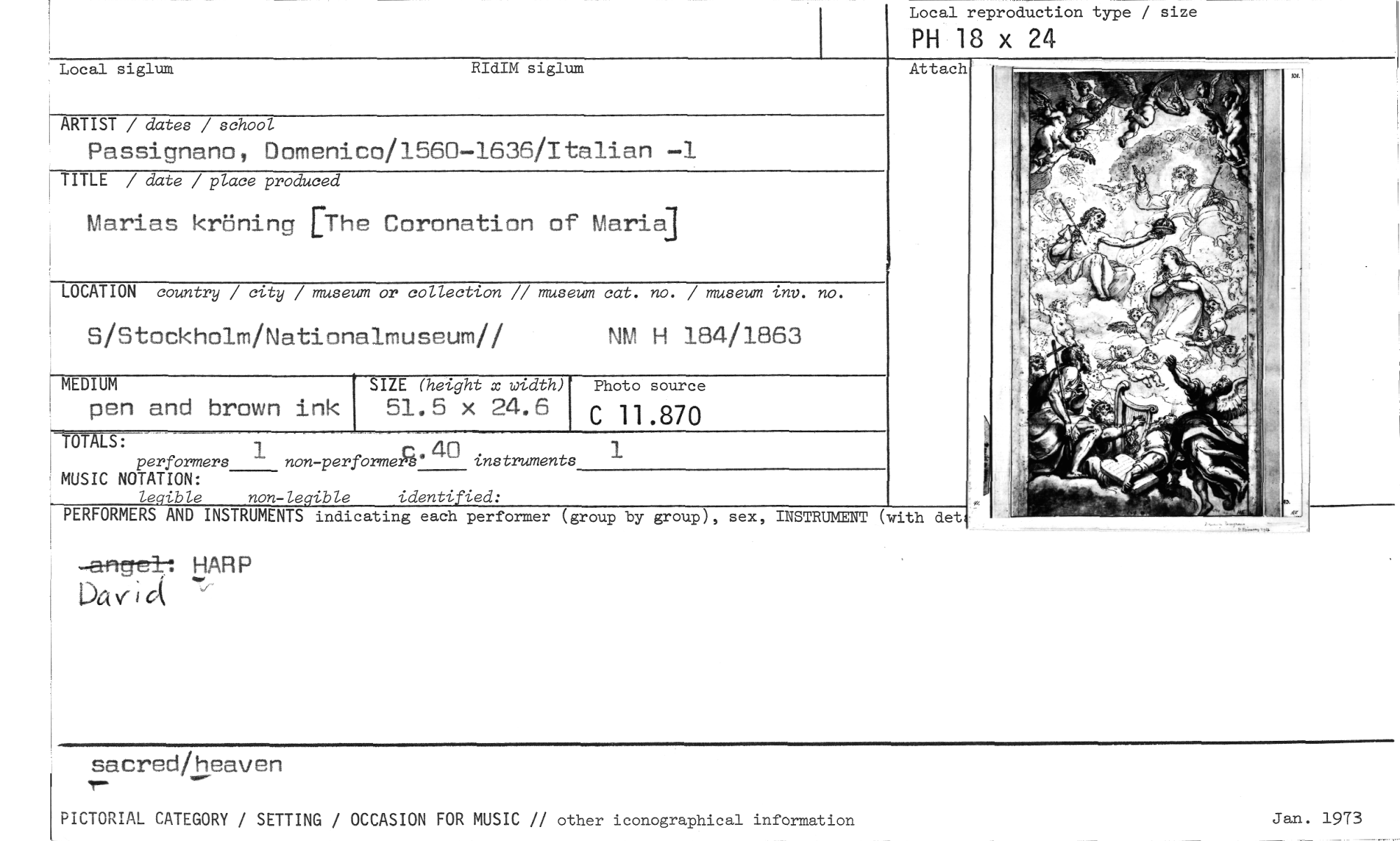 //// Local reproduction type size //// PH 18 x 24 //// Local siglum RIdIM siglum //// ARTIST / dates / school //// Passignano, Domenico/1560-1636/Italian —1 //// TITLE / date / place produced //// Marias kröning [The Coronation of Maria] //// LOCATION country / city / museum or collection // museum cat. no. / museum inv. no. //// S/Stockholm/Nationalmuseum// NM H 184/1863 //// Attach //// MEDIUM SIZE (height x width) //// pen and brown ink 51.5 x 24.6 //// . //// performers non-performers 40 instruments //// MUSIC NOTATION: //// le ible non-le ible identi ied: //// Photo source //// C 11870 1 //// PERFORMERS AND INSTRUMENTS indicating each performer (group by group), sex, INSTRUMENT (with det //// -arm: HARP Dav-icA //// sacred/heaven //// PICTORIAL CATEGORY / SETTING / OCCASION FOR MUSIC // other iconographical information //// Jan. 1973 ////