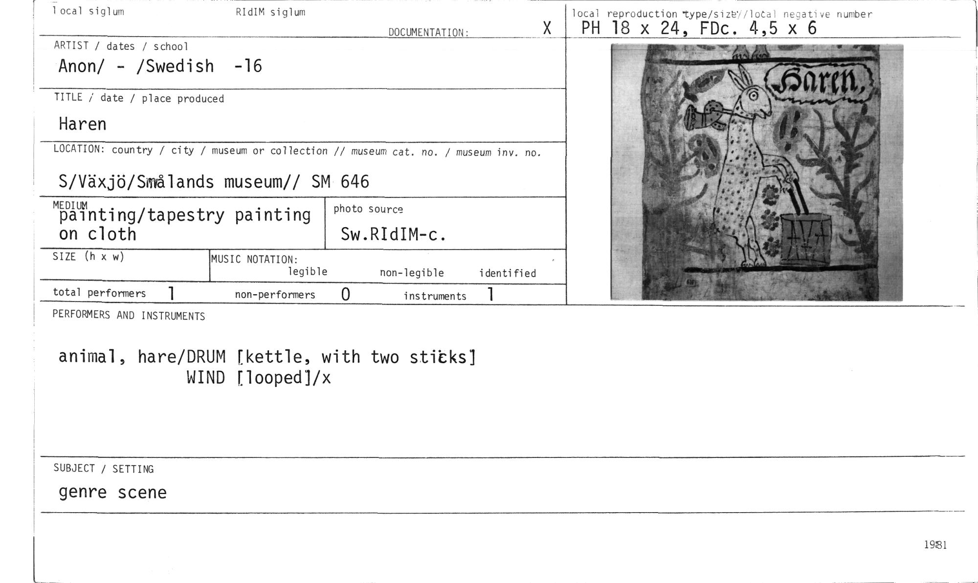 //// PERFORMERS AND INSTRUMENTS //// animal, hare/DRUM rkettle, with two stitks] //// WIND Elooped]/x //// photo source //// Sw.RIdIM-c. //// MEDIUM //// painting/tapestry painting on cloth //// lotal reproduction type/sin7/local negative number //// PH 18 x 24, FDc. 4,5 x 6 //// [ 1 otal siglum //// RIdIM siglum //// DOCUMENTATION• //// ARTIST / dates / school //// Anon/ - /Swedish -16 //// TITLE / date / place produced //// Haren //// LOCATION: country / city / museum or collection // museum cat. no. / museum inv. no. //// S/Växjö/Smålands museum// SM 646 //// SIZE (h x w) //// MUSIC NOTATION: //// legible //// non-legible identified //// instruments 1 //// SUBJECT / SETTING //// genre scene //// 1921 ////