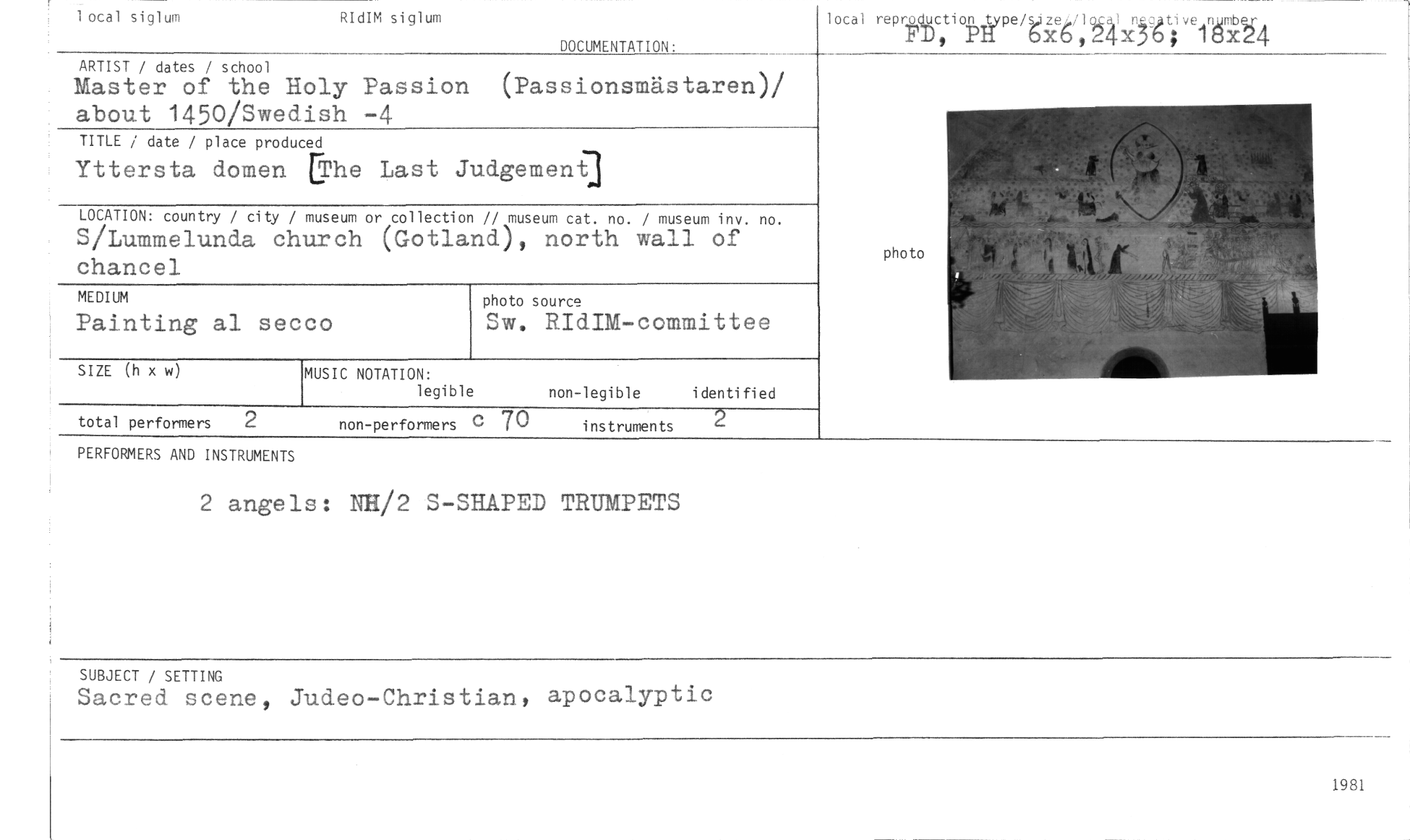 //// 1 otal siglum RIdIM siglum //// DOCUMENTATION: //// lotal reprptc,tiopitype/g3fee6/,1c0 x jgg ti fälb //// ARTIST / dates / school //// Master of the Holy Passion (Passionsmästaren)/ //// about 1450/Swedish —4 //// TITLE / date / place produced //// Yttersta domen EThe Last Judgemen] //// LOCATION: country / city / museum or collection // museum cat. no. / museum inv. no. //// S/Lummelunda church (Gotland), north wall of chancel //// MEDIUM photo source //// Painting al secco Sw. RIdIM-committee //// //// SIZE (h x w) MUSIC NOTATION: non-legible identified //// legible //// //// //// photo //// total performers 2 non-performers c 7 0 instruments 2 //// PERFORMERS AND INSTRUMENTS //// 2 angels: NH/2 S-SHAPED TRUMPETS //// SUBJECT / SETTING //// Sacred scene, Judeo-Christian, apocalyptic //// 1981 ////