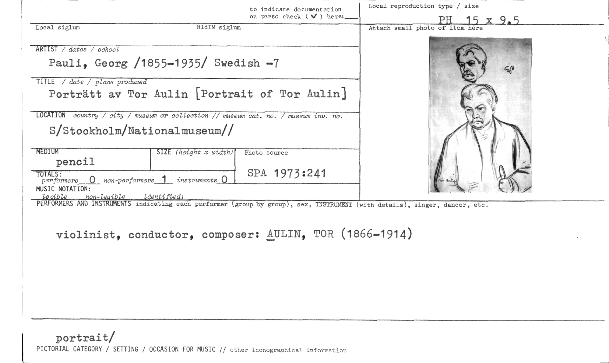 //// Local siglum RIdIM siglum //// to indicate documentation on verso check (N/ ) here: //// Local reproduction type / size //// PH 15 x 9.5 //// Attach small photo of item here //// ARTIST / dates / school //// Pauli, Georg /1855-1935/ Swedish -7 //// TITLE / date / place produced //// Porträtt av Tor Aulin [Portrait of Tor Aulin] //// LOCATION country / city / museum or collection // museum cat. no. / museum inv. no. //// S/Stockholm/Nationalmuseumll //// SIZE (height x width) //// -MYTAT:S: //// per formers 0 non-performere_l_ instruments 0 MUSIC NOTATION: //// leaible non-leaible identified: //// PERFORMERS AND INSTRUMENTS indicating each performer (group by group), sex, INSTRUMENT (with details), singer, dancer, etc. //// violinist, conductor, composer: AULIN„ TOR (1866-1914) //// portrait/ //// PICTORIAL CATEGORY / SETTING / OCCASION FOR MUSIC // other ieonographical information //// MEDIUM //// pencil //// Photo source //// SPA 1973:241 ////