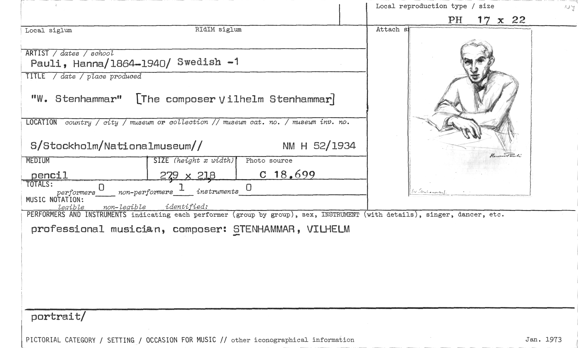 //// Local siglum RIdIM siglum //// Local reproduction type / size //// PH 17 x 22 //// Attach s //// ARTIST / dates / school //// Pauli, Hanna/1864-1940/ Swedish —1 //// TITLE / date / place produced //// "W. Stenhammar" [The composer Vilhelm Stenhammar] //// LOCATION country / city / museum or collection // museum cat. no. / museum inv. no. //// S/Stockholm/Nationalmuseum// NM H 52/1934 //// MEDIUM //// encil //// TOT LS: //// i • //// -c //// performers non-performers instruments //// MUSIC NOTATION: //// legible non-legible identified: //// PERFORMERS AND INSTRUMENTS indicating each performer (group by group), sex, INSTRUMENT (with details), singer, dancer, etc. //// professional musician, composer: STENHAMMAR, VILHELM //// portrait/ //// PICTORIAL CATEGORY / SETTING / OCCASION FOR MUSIC // other iconographical information Jan. 1973 ////