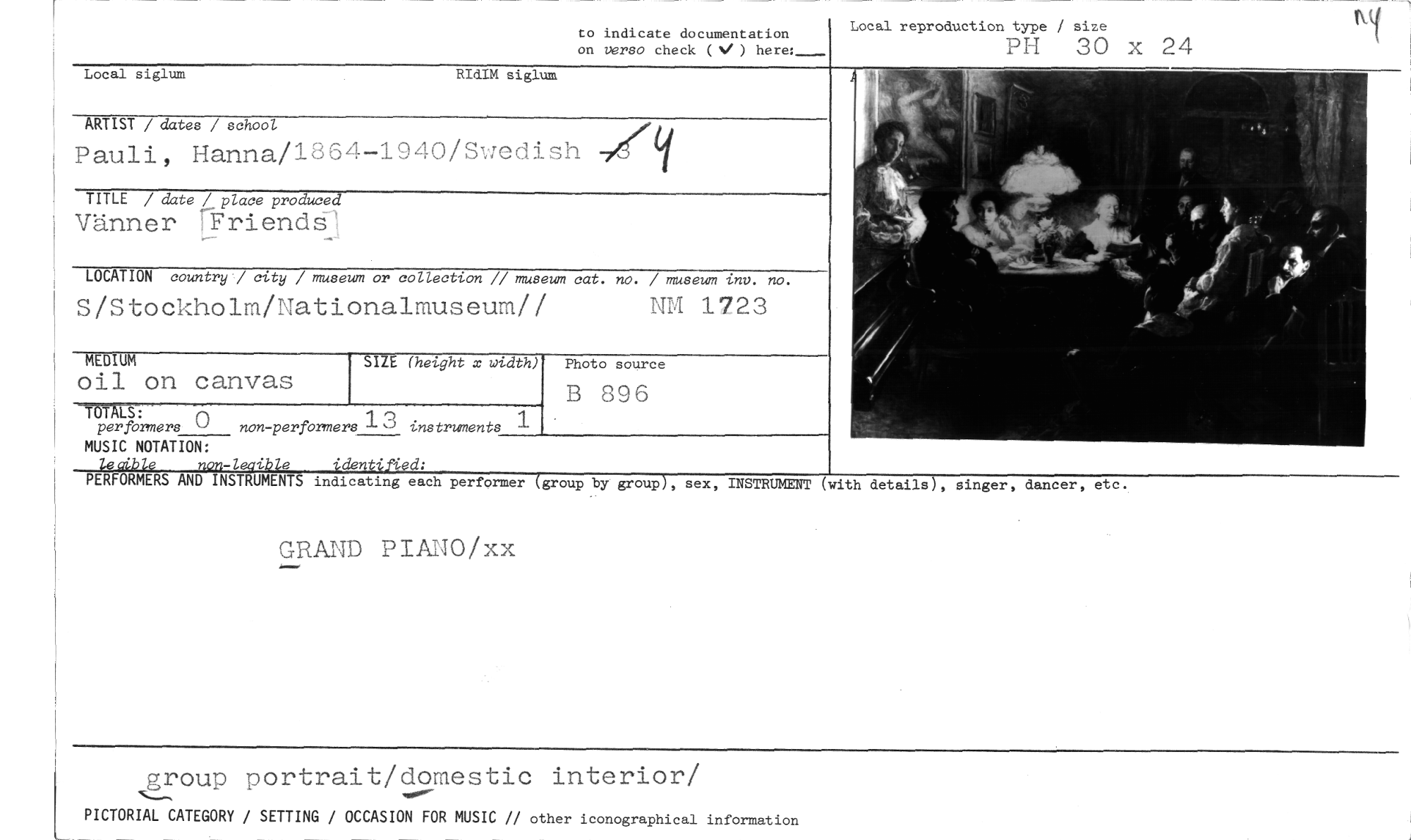//// to indicate documentation //// on verso check (V) here:___ //// Local reproduction type / size //// PH 30 x 24 //// Local siglum RIdIM siglum //// ARTIST / dater / school //// Pauli, Hanna/1864-1940/Swedish ?it/ //// TITLE / date / place produced //// Vänner n"riendål //// LOCATION country / city / museum or collection // museum cat. no. / museum inv. no. //// S/Stockholm/Nationalmuseum// NM 1723 //// MEDIUM //// oil on canvas //// Photo source //// SIZE (height x width) //// B 896 //// TÖTALS: //// per formers C) non -perfbrmers 13 instruments //// MUSIC NOTATION: //// igaib/e nnp-legible identified: //// PERFORMERS AND INSTRUMENTS indicating each performer (group by group), sex, INSTRUMENT (with details), singer, dancer, etc. //// GRAND PIANO/xx //// group portrait/domestic interior/ //// PICTORIAL CATEGORY / SETTING / OCCASION FOR MUSIC // other iconographical information ////