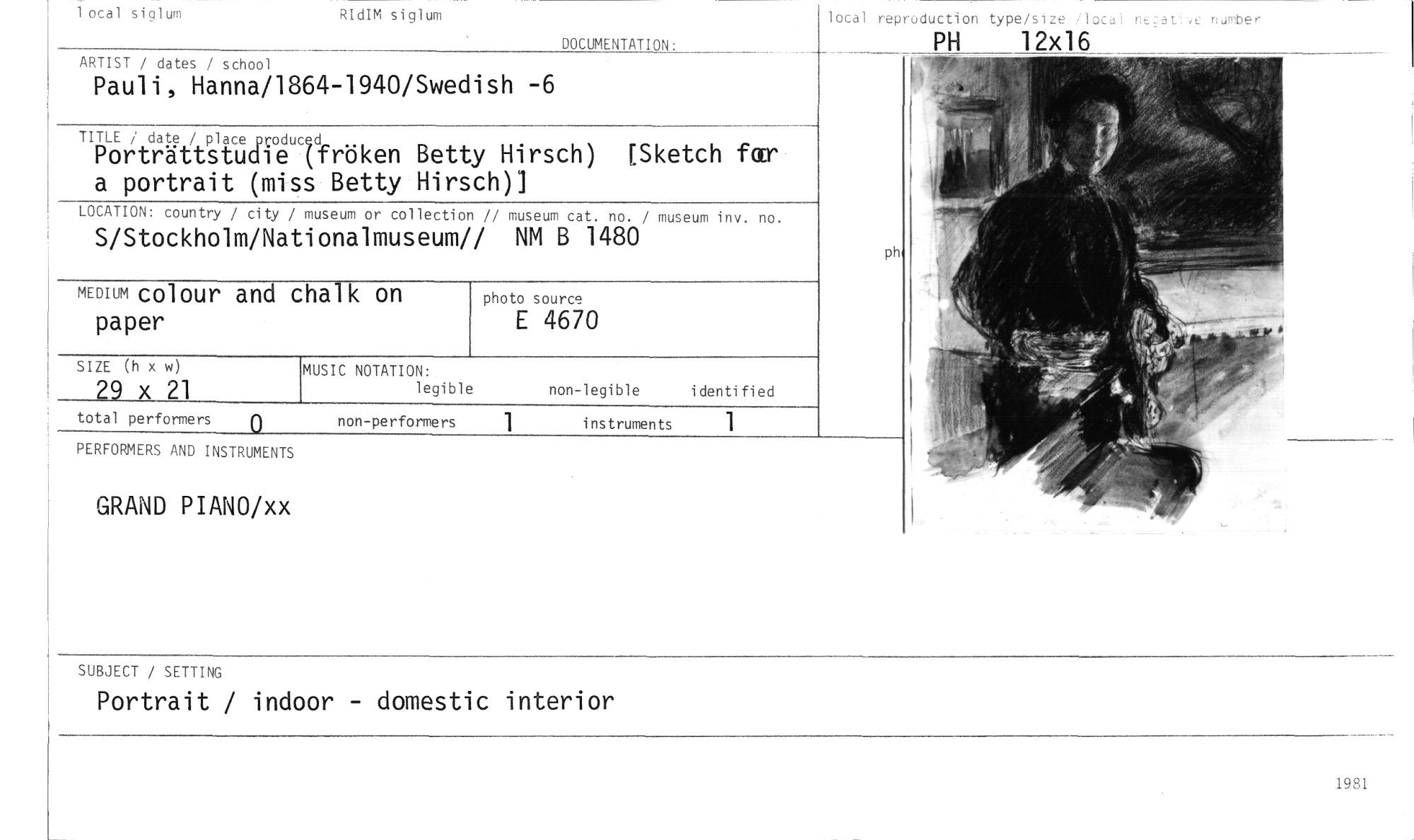 //// 1981 //// museum or collection // museum cat. no. / museum inv. no. //// ionalmuseum// NM B 1480 //// LOCATION: country / city / //// S/Stockholm/Nat //// MEDIUM colour and c paper //// halk on //// non-legible identified //// MUSIC NOTATION: //// legible //// non-performers //// 1 instruments 1 //// 1 otal siglum RIdIM siglum //// DOCUMENTATION: //// ARTIST / dates / school //// Pauli, Hanna/1864-1940/Swedish -6 //// TITLE / date / placeocoduced //// Porträttstudie (fröken Betty Hirsch) [Sketch for //// a portrait (miss Betty Hirsch)] //// PERFORMERS AND INSTRUMENTS //// GRAND PIANO/xx //// SIZE (h x w) //// 29 x 21 //// total performers //// photo source //// E 4670 //// SUBJECT / SETTING //// Portrait / indoor - domestic interior //// lotal reproduction type/size /lotal ne:,atH number //// PH 12x16 //// ph ////