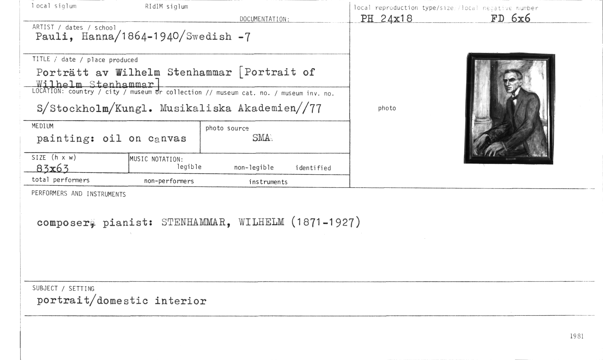 //// 1 ocal siglum RIdIM siglum lotal reproduction type/size.doca! neath,e nurober //// DOCUMENTATION: PH 24x18 FD 6x6 //// //// ARTIST / dates / school //// Pauli, Hanna/1864-1940/Swedish -7 //// TITLE / date / place produced //// Porträtt av Wilhelm Stenhammar [Portrait of Wilhelm Stenhammar //// LOCATION: country / city / museum Jr collection // museum cat, no. / museum inv. no. //// S/Stockholm/Kungl. Musikaliska Akademien//77 //// photo source //// SMÅ', //// SIZE (h x w) //// R3T63 //// MEDIUM //// painting: oil on canvas //// MUSIC NOTATION: //// legible non-legible identified //// photo //// total performers non-performers instruments //// PERFORMERS AND INSTRUMENTS //// composer pianist: STENHAMMR, WILHELM (1871-1927) //// SUBJECT / SETTING //// portrait/domestic interior //// 19 81 ////
