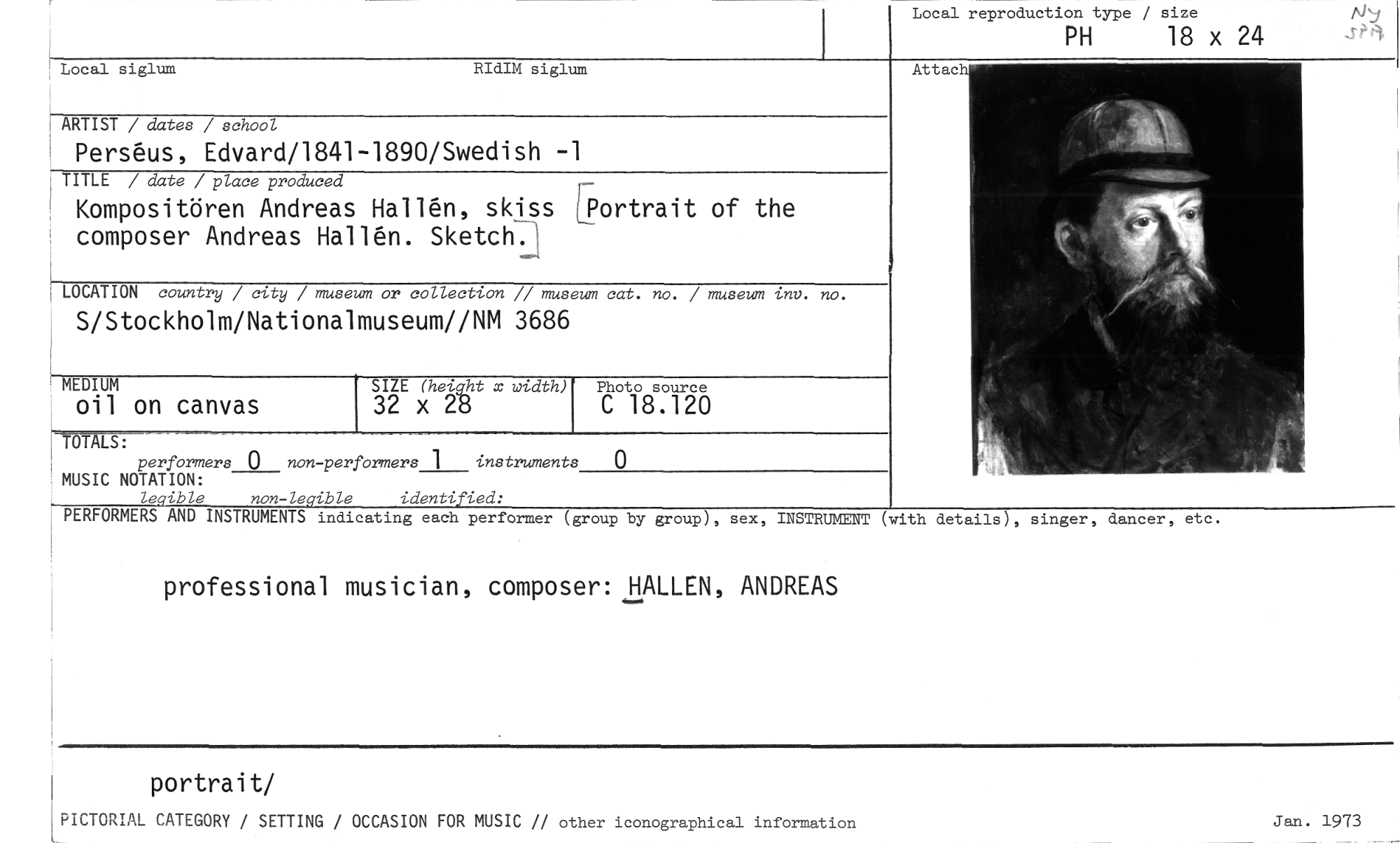 //// Local reproduction type / size //// PH 18 x 24 //// Local siglum RIdIM siglum //// 1 ARTIST / dates / school //// PerAus, Edvard/1841-1890/Swedish -1 //// TITLE / date / place produced //// Kompositören Andreas Ha1Mn, skiss (portrait of the composer Andreas HalMn. Sketch. //// LOCATION country / city / museum or collection // museum cat. no. / museum inv. no. //// S/Stockholm/Nationalmuseum//NM 3686 //// Attac //// MEDIUM //// oil on canvas //// SIZE (height x width) //// 32 x 28 //// C 18.120 //// TOT IS: //// performers 0 non-performers 1 instruments 0 //// MUSIC NOTATION: //// le ible non-le ible identi ied: //// PERFORMERS AND INSTRUMENTS indicating each performer (group by group), sex, INSTRUMENT //// with details), singer, dancer, etc. //// professional musician, composer: HALLEN, ANDREAS //// portrait/ Jan. 1973 //// PICTORIAL CATEGORY / SETTING / OCCASION FOR MUSIC // other iconographical information ////