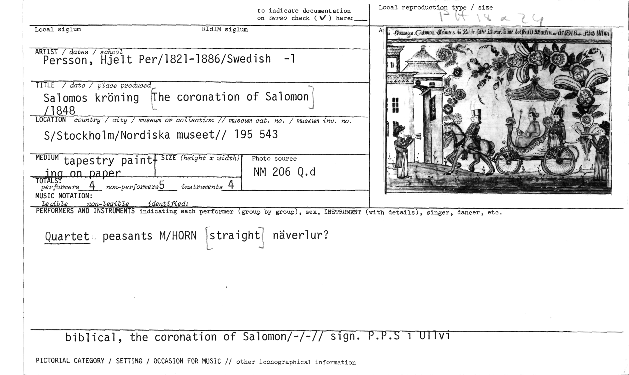 //// to indicate documentation on versa check (V ) here: //// Local reproduction type / size //// Local siglum RIdIM siglum //// it a Cabett.litniaft 4efit. liaiVittratla.41-.4ethal.Watliu.,dr4ey tubvi //// ARTIST / dates / school //// Persson, Hjelt Per/1821-1886/Swedish -1 //// TITLE / date / place produced //// Salomos kröning The coronation of Salomon //// /1848 //// LOCATION country / city / museum or collection // museum cat. no. / museum inv. no. //// S/Stockholm/Nordiska museet!! 195 543 //// MEDIUMtapestry paint- SIZE (height x width) //// irul nn paper //// MALS!" //// perfårmers 4 non-performers5 instruments 4 //// Photo source //// MM 206 Q.d //// MUSIC NOTATION: //// lealbie non-lecikle identified: //// PERFORMERS AND INSTRUMENTS indicating each performer (group by group), sex, //// INSTRUMENT (with details), singer, dancer, etc. //// Quartet, peasants M/HORN straight! näverlur? //// biblical, the coronation of Salomon/-/-// sign. P.P.S i Olivi //// PICTORIAL CATEGORY SETTING OCCASION FOR MUSIC n other iconographical information ////