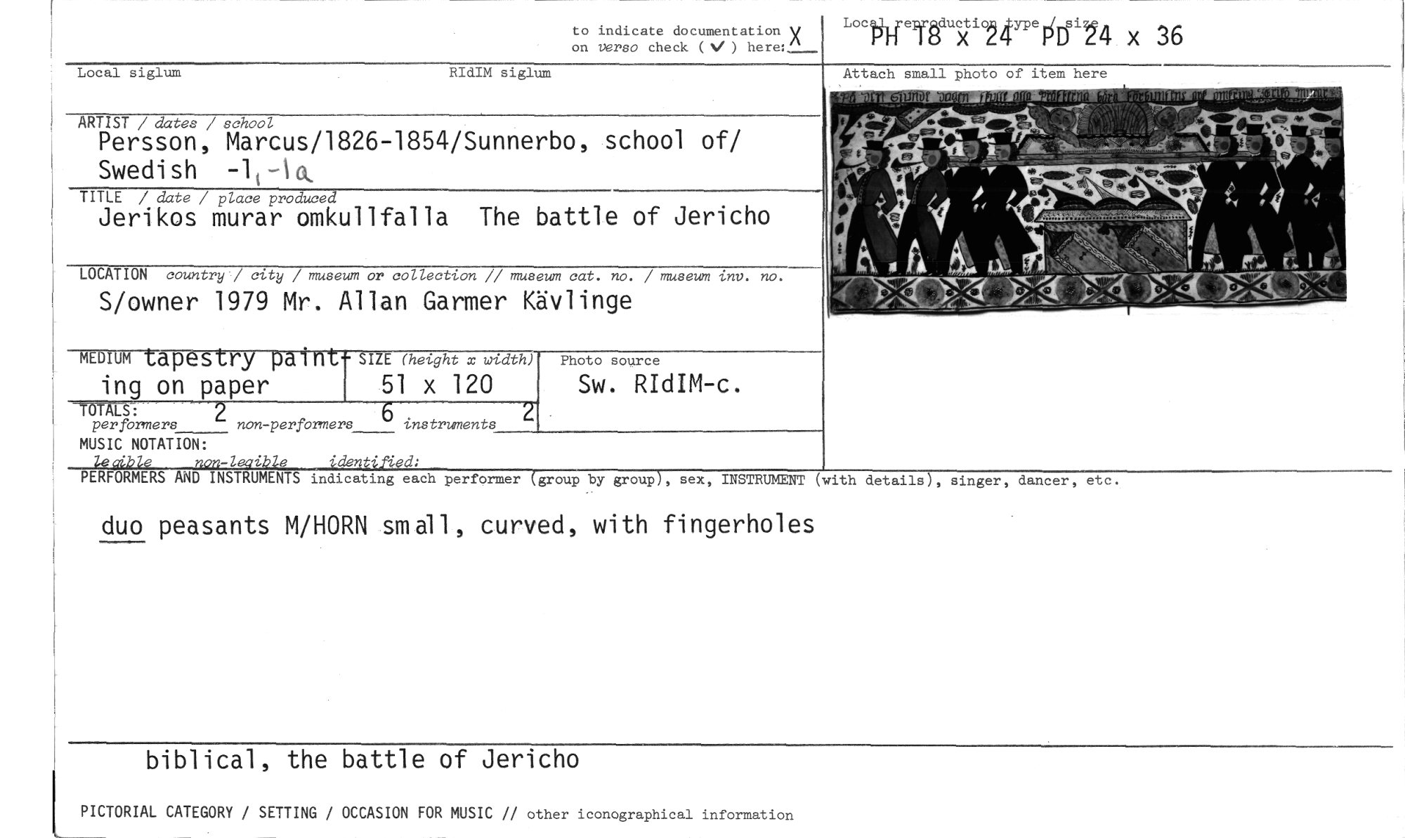//// to indicate documentation V on verso check (NI ) //// Locp_reyes P //// ype_y_s //// D 4 x 36 //// Local siglum RIdIM siglum //// ARTIST / dates / school //// Persson, Marcus/1826-1854/Sunnerbo, school of/ Swedish -1,-16L //// TITLE / date / place produced //// Jerikos murar omkullfalla The battle of Jericho //// LOCATION country / city / museum or collection // museum cat. no. / museum inv. no. //// S/owner 1979 Mr. Allan Garmer Kävlinge //// Attach small photo of item here //// MEDIUM tapestry patnt- SIZE (height x width) //// ing on paper 51 x 120 //// TOTALS: 2 6 //// per formers non-performers instruments //// MUSIC NOTATION: //// "r e '612-ntified: //// ' ge //// Photo source //// Sw. RIdIM-c. //// PERFORMERS AND INSTRUMENTS indicating each performer (group by group), sex, INSTRUMENT (with details), singer, dancer, etc. //// duo peasants M/HORN small, curved, with fingerholes //// biblical, the battle of Jericho //// PICTORIAL CATEGORY / SETTING / OCCASION FOR MUSIC // other iconographical information ////