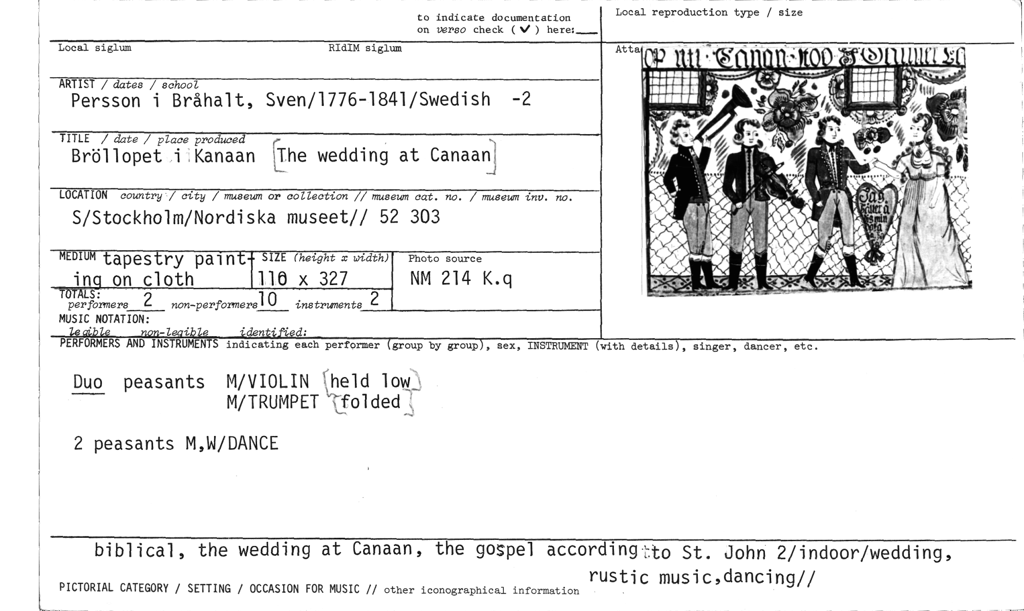 //// Duo peasants M/VIOLIN \held low //// M/TRUMPET //// 2 peasants M,W/DANCE //// biblical, the wedding at Canaan, the gospel accordingto St. John 2/indoor/wedding, //// rustic music,dancing// //// PICTORIAL CATEGORY / SETTING / OCCASION FOR MUSIC // other iconographical information //// MUSIC NOTATION: //// non-leaible identified: //// PERFORMERS AND INSTRUMENTS //// indicating each performer (group //// sex, INSTRUMENT (with details), singer, dancer, etc. //// by group), //// to indicate documentation //// on verso check (V ) here:_ //// Local siglum RIdIM siglum //// ARTIST / dates / school //// Persson i Bråhalt, Sven/1776-1841/Swedish -2 //// TITLE / date / place produced //// Bröllopet i .Kanaan IThe wedding at Canaan //// LOCATION country / city / museum or collection // museum cat. no. / museum inv. no. //// S/Stockholm/Nordiska museet// 52 303 //// Local reproduction type / size //// Atta //// MEDIUM tapestry paint- SIZE (hetght x width) //// ing on cloth 116 x 327 //// Tana: //// per formers g non-performers10 instruments 2 //// Photo source //// NM 214 K.q ////