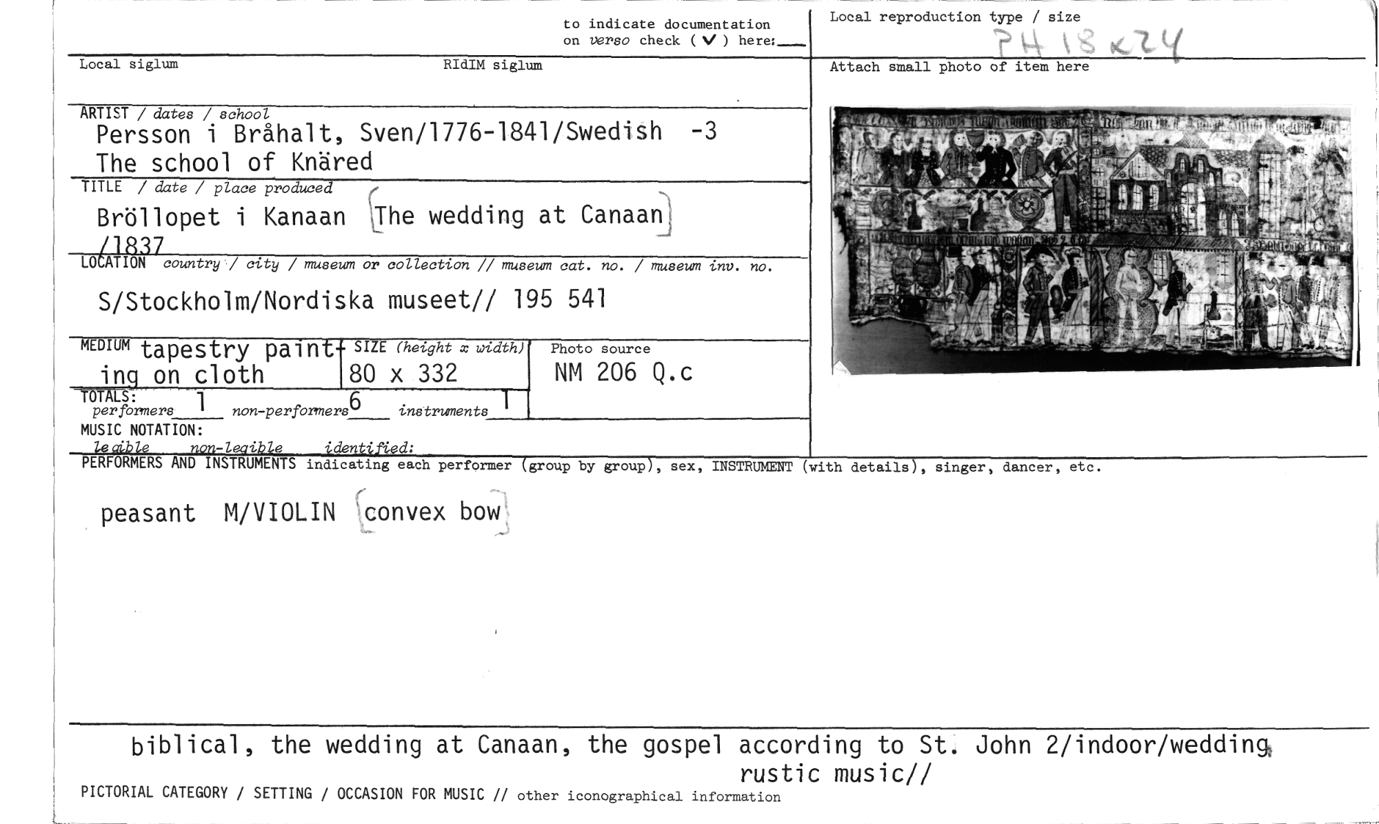 //// to indicate documentation //// on verso check (N/ ) here:.—...— //// Local reproduction type / size //// Local siglum RIdIM siglum //// ARTIST / dates / school //// Persson i Bråhalt, Sven/1776-1841/Swedish -3 The school of Knäred //// TITLE / date / place produced //// Bröllopet i Kanaan The wedding at Canaanj //// /1837 //// LOLATION country / city / museum or collection // museum cat. no. / museum inv. no. //// S/Stockholm/Nordiska museet// 195 541 //// Attach small photo //// MEDIUM tapestry paint- SIZE (height m width) //// ing on cloth 80 x 332 //// TOTÄLS //// 1 //// instruments 1 //// per formers i non-performers 6 //// Photo source //// NM 206 Q.c //// MUSIC NOTATION: //// lecible non-leaible identifi.ed; //// PERFORMERS AND INSTRUMENTS indicating each performer (group by group), sex, INSTRUMENT //// peasant M/VIOLIN 'convex bow //// (with details), singer, dancer, etc. //// biblical, the wedding at Canaan, the gospel according to St. John 2/indoor/wedding; //// rustic music// //// PICTORIAL CATEGORY / SETTING / OCCASION FOR MUSIC // other iconographical information ////