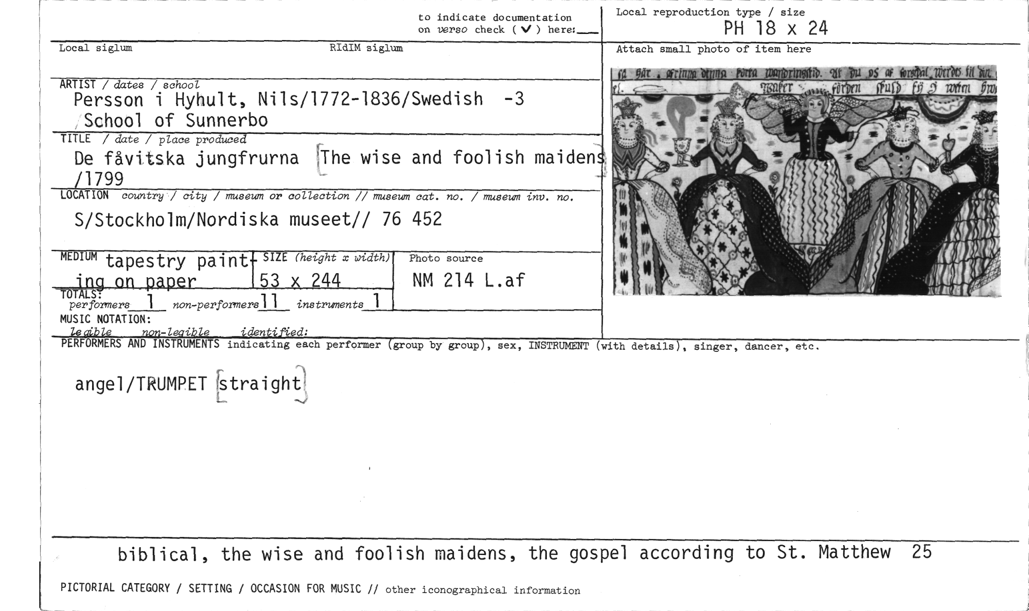 //// PICTORIAL CATEGORY / SETTING / OCCASION FOR MUSIC // other iconographical information //// e //// photo //// Local siglum //// RIdIM siglum //// to indicate documentation //// on verso check (N/ ) here: //// Local reproduction type / size //// PH 18 x 24 //// ARTIST / dates / school //// Persson i Hyhult, Nils/1772-1836/Swedish -3 School of Sunnerbo //// TITLE / date / place produced //// De fåvitska jungfrurna The wise and foolish maiden //// /1799 //// LOCATION country / city / museum or collection // museum cat. no. / museum inv. no. //// S/Stockholm/Nordiska museet// 76 452 //// MEDIUM tapestry paint- SIZE (height x width) ing on paper 53 x 244 //// TÖTALS: //// per formers 1 non-perprmers1 1 instruments 1 //// fil Or 'frini a kana hgta //// 0",r44100. 2« IU ft5 af orgNit.ttrks im TT ' Yelxn 114D //// -neir //// MUSIC NOTATION: //// ieyible non-legible identffied: //// PERFORMERS AND INSTRUMENTS indicating each performer (group by group), //// angel/TRUMPET rstraight //// biblical, the wise and foolish maidens, the gospel according to St. Matthew 25 //// Photo source //// NM 214 L.af //// sex, INSTRUMENT (with details), singer, dancer, etc, ////