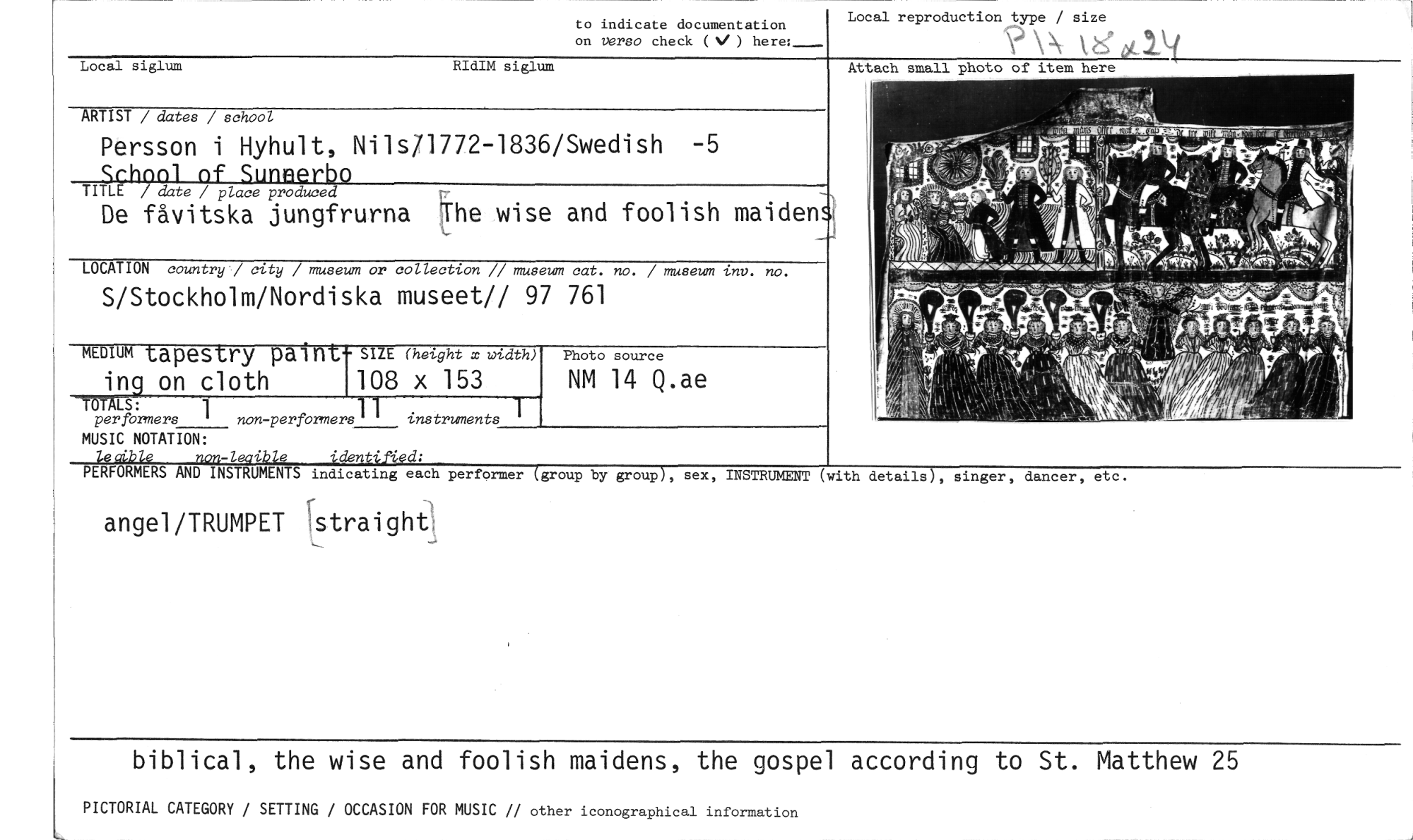//// to indicate documentation //// on verso check (4/ ) here:_._ //// Local reproduction type / size //// Local siglum RIdIM siglum //// Attach //// ARTIST / dates / school //// Persson i Hyhult, Nils71772-1836/Swedish -5 //// Schonl nf Suneerh //// TITLE / date / place produced //// De fåvitska jungfrurna The Ovise and foolish maiden //// LOCATION country' city / museum or collection // museum cat. no. / museum inv. no. //// S/Stockholm/Nordiska museet// 97 761 //// Photo source //// NM 14 Q.ae //// ?OTALS: //// per formers 1 non-performers1 1 instruments 1 //// MUSIC NOTATION: //// lecible non-leaible identified: //// PERFORMERS AND INSTRUMENTS indicating each performer (group by group), sex, //// angel/TRUMPET straigh.q //// MEDIUM tapestry paint- SIZE (height x width) //// ing on cloth 108 x 153 //// INSTRUMENT (with detailsY, singer, dancer, etc. //// biblical, the wise and foolish maidens, the gospel according to St. Matthew 25 //// PICTORIAL CATEGORY / SETTING / OCCASION FOR MUSIC // other iconographical information ////