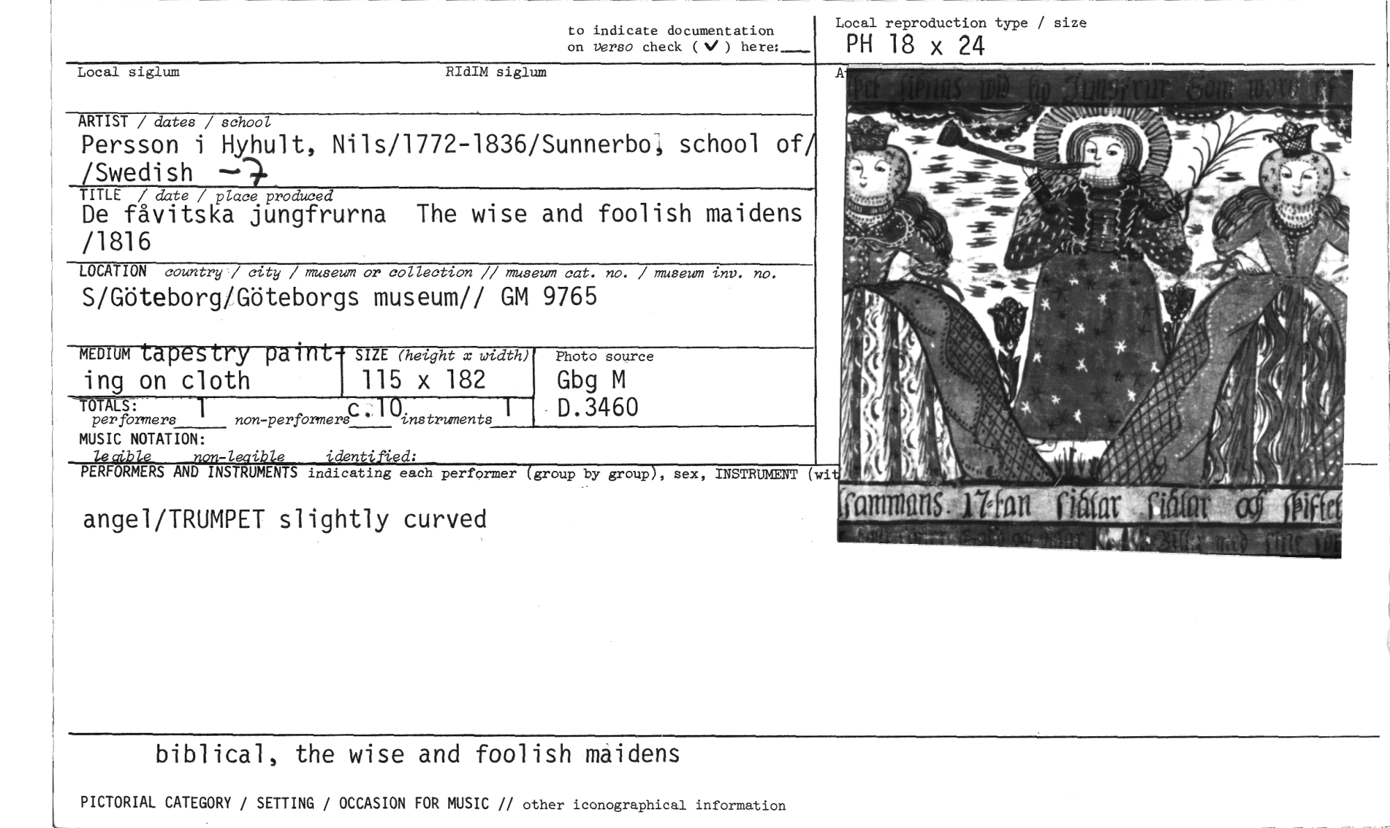 //// to indicate documentation Local reproduction type / size //// on verso check (.4,/ ) here:_--- PH 18 x 24 //// Local s glum RIdIM siglum //// ARTIST / dates / school //// Persson i Hyhult, Nils/1772-1836/Sunnerbo-, school of/ //// /Swedish --g. //// TITLE / date / place produced //// De fåvitska jungfrurna The wise and foolish maidens /1816 //// LOCATION country / city / museum or collection // museum cat. no. / museum 1.nv. no. //// S/Göteborg/Göteborgs museum// GM 9765 //// MEDIUM tapestry paint- SIZE (height x width) //// ing on cloth 115 x 182 //// per formers non-performej''1 °instruments r-- Photo source //// Gbg M D.3460 //// MUSIC NOTATION: //// -1 i• e 'de • i-d: //// PERFORMERS AND INSTRUMENTS indicating each performer group by group , sex, INSTRUMENT //// angel/TRUMPET slightly turved //// biblical, the wise and foolish maidens //// PICTORIAL CATEGORY / SETTING / OCCASION FOR MUSIC // other iconographical information ////