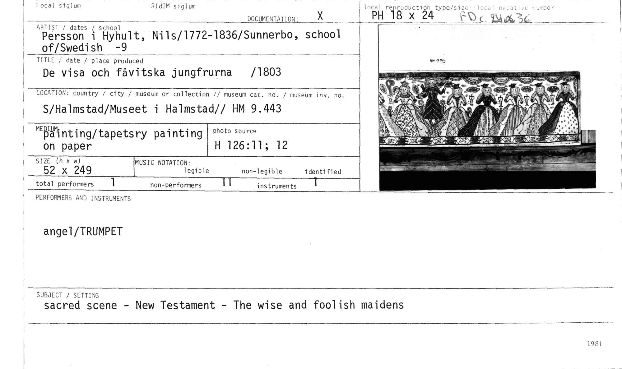 //// angel/TRUMPET //// SUBJECT / SETTING //// sacred scene - New Testament - The wise and foolish maidens //// lotal re roduction type/size-Ilocal neaUve number //// PH 18 x 24 i O e. tura.36, //// 1 otal siglum RIdIM siglum //// DOCUMENTATION: X //// ARTIST / dates / school //// Persson i Hyhult, Nils/1772-1836/Sunnerbo, school of/Swedish -9 //// TITLE / date / place produced //// De visa och fåvitska jungfrurna /1803 //// LOCATION: country / city / museum or collection // museum cat. no. / museum inv. no. //// S/Halmstad/Museet i Halmstad// HM 9.443 //// 94Y3 //// SIZE (h x w) //// 52 x 249 //// total performers 1 //// MUSIC NOTATION: //// legible //// Winting/tapetsry painting on paper //// photo source //// H 126:11; 12 //// non-legible identified //// non-performers 11 instruments //// PERFORMERS AND INSTRUMENTS //// 1981 ////