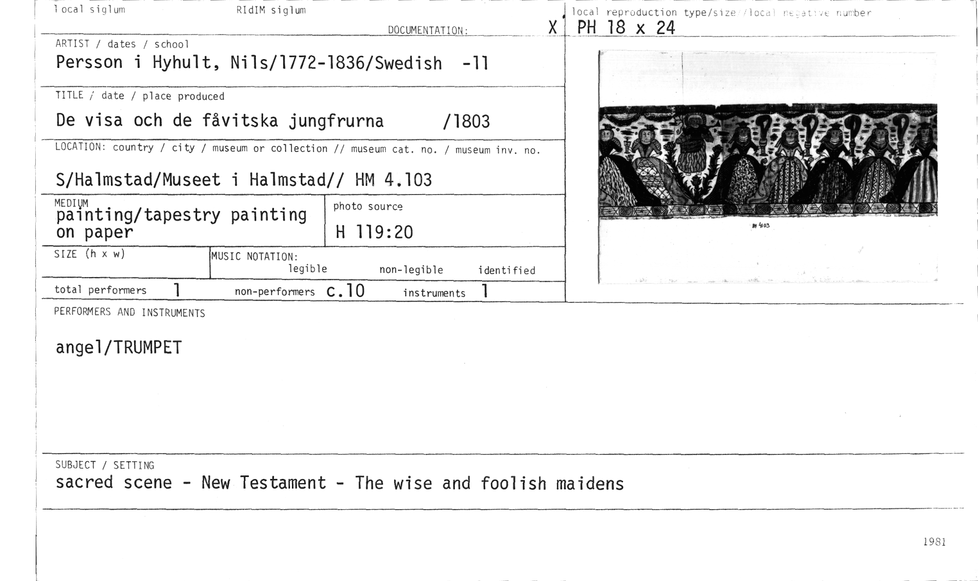 //// SUBJECT / SETTING //// sacred scene - New Testament - The wire and foolish maidens //// 1981 //// total performers 1 //// non-performers C .10 instruments 1 //// lotal siglum //// RIdIM siglum //// DOCUMENTATION: X //// lotal reproduction type/size local neativt number //// PH 18 x 24 //// ARTIST / dates / school //// Persson i Hyhult, Nils/1772-1836/Swedish -11 //// TITLE / date / place produced //// De visa och de fåvitska jungfrurna /1803 //// LOCATION: country / city / //// S/Halmstad/Musee //// MEDIUM //// painting/tapestry painting on paper //// SIZE (h x w) //// MUSIC NOTATION: //// legible non-legible i denti fi ed //// PERFORMERS AND INSTRUMENTS //// angel/TRUMPET //// museum or collection // museum cat. no. / museum inv. no. //// t i Halmstad// HM 4.103 //// photo source //// H 119:20 ////