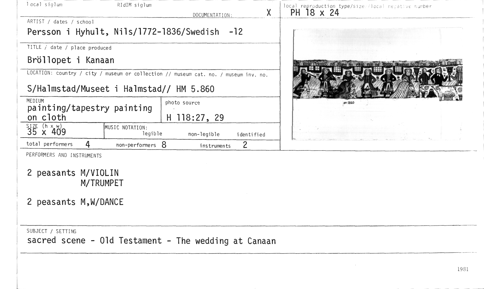 //// SUBJECT / SETTING //// sacred scene - Old Testament - The wedding at Canaan //// museum or collection // museum cat. no. / museum inv. no. //// LOCATION: country / city / //// non-performers 8 instruments 2 //// 4 //// total performers //// 1 otal siglum RIdIM siglum //// DOCUMENTATION: //// ARTIST / dates / school //// Persson i Hyhult, Nils/1772-1836/Swedish -12 //// TITLE / date / place produced //// Bröllopet i Kanaan //// S/Halmstad/Musee //// MEDIUM //// painting/tapestry painting on cloth //// SIZE (h x w) //// 35 x 409 //// PERFORMERS AND INSTRUMENTS //// 2 peasants M/VIOLIN //// M/TRUMPET //// 2 peasants M,W/DANCE //// t i Halmstad// HM 5.860 //// MUSIC NOTATION: //// legible //// photo source //// H 118:27, 29 //// non-legible identified //// lotal re roduction type/size. lotal nc;atve nurober //// PH 18 x 24 //// af.Ter" //// a e E //// P 5860 //// 19,9,1 ////