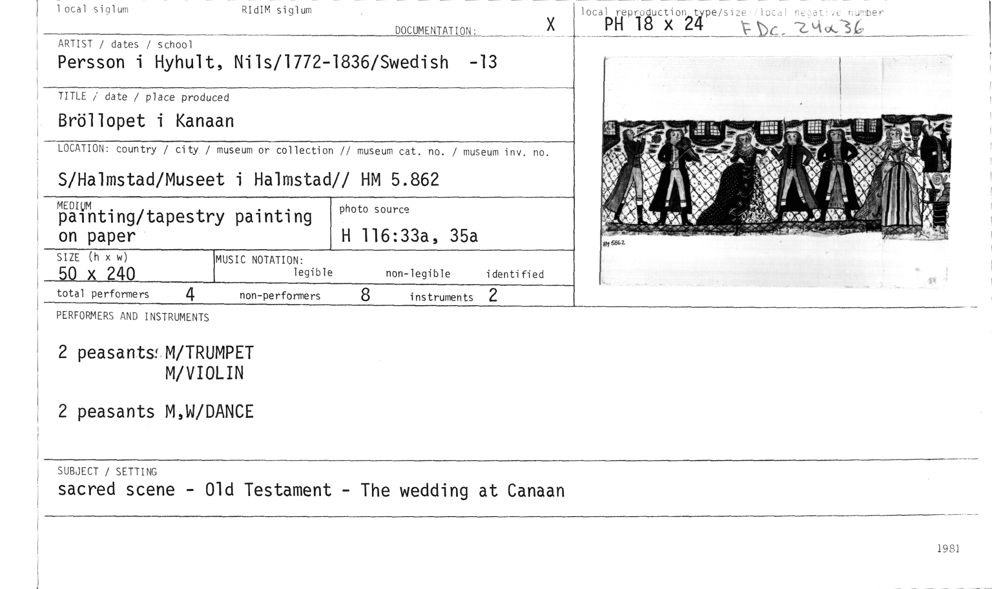 //// 1981 //// total performers //// 4 non-performers 8 instruments 2 //// local reproduction type/size:flocal negat*4c nurober //// Pill 18 x 24 be, -LA d:34, //// 1 otal siglum //// RIdIM siglum //// DOCUMENTATION //// ARTIST / dates / school //// Persson i Hyhult, Nils/1772-1836/Swedish -13 //// TITLE / date / place produced //// Bröllopet i Kanaan //// LOCATION: country / city / museum or collection // museum cat. no. / museum inv. no. //// S/Halmstad/Museet i Halmstad// HM 5.862 //// Ninum //// painting/tapestry painting //// on paper //// SIZE (h x w) //// 50 x 240 //// photo source //// å A. te //// an» M //// H 116:33a, 35a //// PERFORM ERS AND INSTRUMENTS //// 2 peasantsfM/TRUMPET //// M/VIOLIN //// 2 peasants M,W/DANCE //// SUBJECT / SETTING //// sacred scene - Old Testament - The wedding at Canaan ////