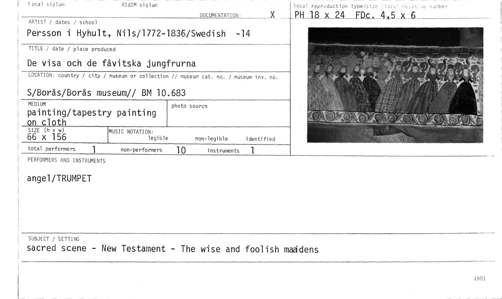 //// l ocal siglum RIdIM siglum //// DOCUMENTATION• //// ARTIST / dates / school //// Persson i Hyhult, Nils/1772-1836/Swedish -14 //// TITLE / date / place produced //// De visa och de fåvitska jungfrurna //// LOCATION: country / city / museum or collection // museum cat. no. / museum inv. no. //// S/Borås/Borås museum// BM 10.683 //// MEDIUM //// painting/tapestry painting //// on cloth //// SIZE (h x w) //// 66 x 156 //// lotal reproduction type/size:/local ne_;ative nurober //// PH 18 x 24 FDc. //// x //// photo source //// MUSIC NOTATION: //// legible //// non-legible identified //// total performers 1 non-performers 10 instruments 1 //// PERFORMERS AND INSTRUMENTS //// angel/TRUMPET //// SUBJECT / SETTING //// sacred scene - New Testament - The wise and foolish maå dens //// 1981 ////