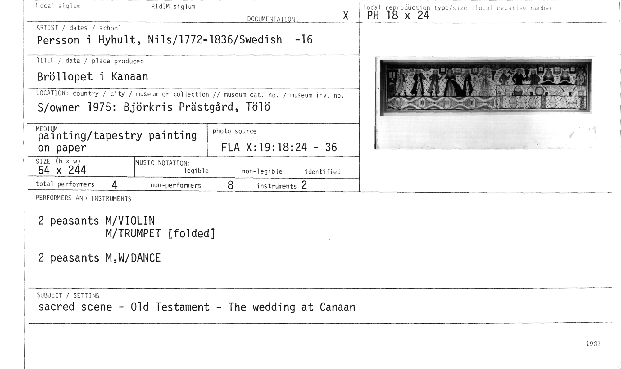 //// 1 otal siglum RIdIM siglum //// DOCUMENTATION //// lotal reproduction type/size/lotal negative nurober //// PH 18 x 24 //// ARTIST / datm / school //// Persson i Hyhult, Nils/1772-1836/Swedish -16 //// TITLE / date / place produced //// Bröllopet i Kanaan //// LOCATION: country / city / museum or collection // museum cat. no. / museum inv. no. //// S/owner 1975: Björkris Prästgård, Tölö //// MEDIUM //// painting/tapestry painting on paper //// photo source //// FLA X:19:18:24 - 36 //// SIZE (h x w) //// 54 x 244 //// MUSIC NOTATION: //// legible //// non-legible identified //// total performers 4 non-performers 8 instruments 2 //// PERFORMERS AND INSTRUMENTS //// 2 peasants M/VIOLIN //// M/TRUMPET [folded] //// 2 peasants M,W/DANCE //// SUBJECT / SETTING //// sacred scene - Old Testament - The wedding at Canaan //// 1981 ////