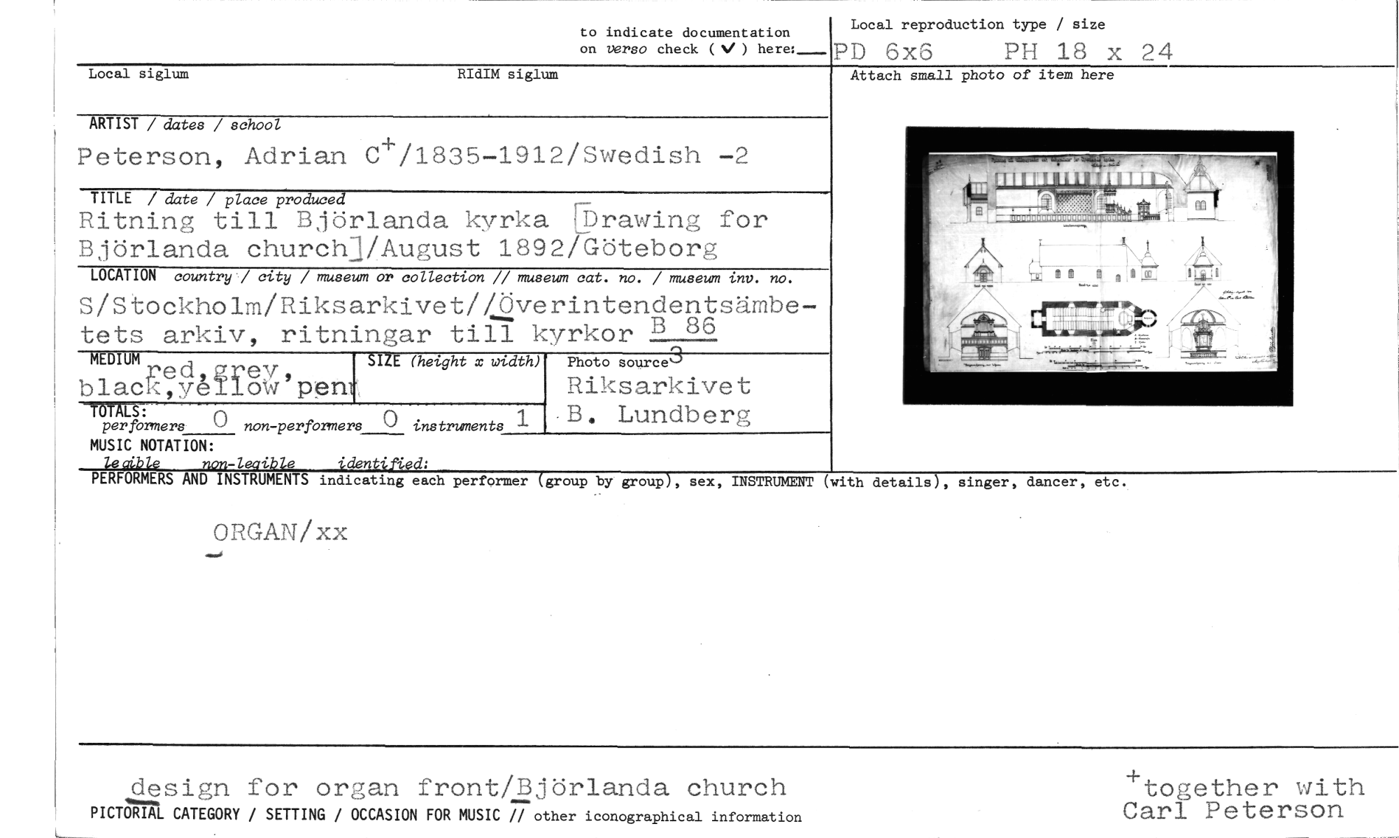 //// to indicate documentation //// on versa check (V ) here:_ //// Local reproduction type / size //// PI) 63(8 PH 18 x 24 //// Attach small photo of item here //// ARTIST / dates / school //// Peterson, Adrian C /1835-1912/Swedish -2 //// TITLE / date / place produced //// Ritning till Björlanda kyrka [Drawing for Blörlanda church/August 1892/Göteborg //// LOCATION country / city / museum or collection // museum cat. no. / museum inv. no. //// S/Stockholm/Riksarkivet//Överintendentsämbetets arkiv, ritningar till kyrkor h82 //// ORGAN/xx //// MEMMred.grev, //// blacK yeiloW penl //// -337711: //// per formers non-performers instrwnents //// MUSIC NOTATION: //// abje non-leaible identified: //// FORMERS AND INSTRUMENTS indicating each performer (group by group), sex, INSTRUMENT //// Slit (height x width) //// Photo source //// Riksarkivet //// B. Lundberg //// (with details), singer, dancer, etc. //// Local siglum //// RIdIM siglum //// design for organ front/Björlanda church +together with Carl Peterson //// PICTORIAL CATEGORY / SETTING / OCCASION FOR MUSIC // other iconographical information ////