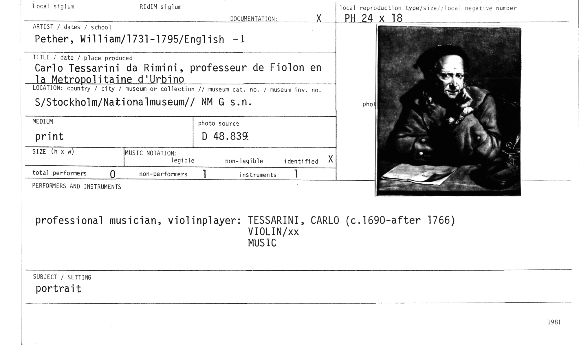 //// professional musician, violinplayer: TESSARINI, CARLO (c.1690-after 1766) //// VIOLIN/xx //// MUSIC //// lotal reproduction type/size//local negative nurober //// _21:1_24 x 18 //// TITLE / date / place produ //// Carlo Tessarini a Metropolitain //// LOCATION: country / city / //// S/Stockholm/Nat //// 1 //// PERFORMERS AND INSTRUMENTS //// MUSIC NOTATION: //// legible //// non-legible identified X //// non-performers 1 instruments 1 //// total performers //// ARTIST / dates / school //// Pether, William/1731-1795/English -1 //// MEDIUM //// print //// SIZE (h x w) //// photo source //// D 48.839 //// ed //// da Rimini, professeur de Fiolon en e d'Urbino //// museum or collection // museum cat. no. / museum inv. no. //// ionalmuseum// NM G s.n. phot //// 1 ocal siglum RIdIM siglum //// DOCUMENTATION: //// SUBJECT / SETTING //// portrait //// 1981 ////