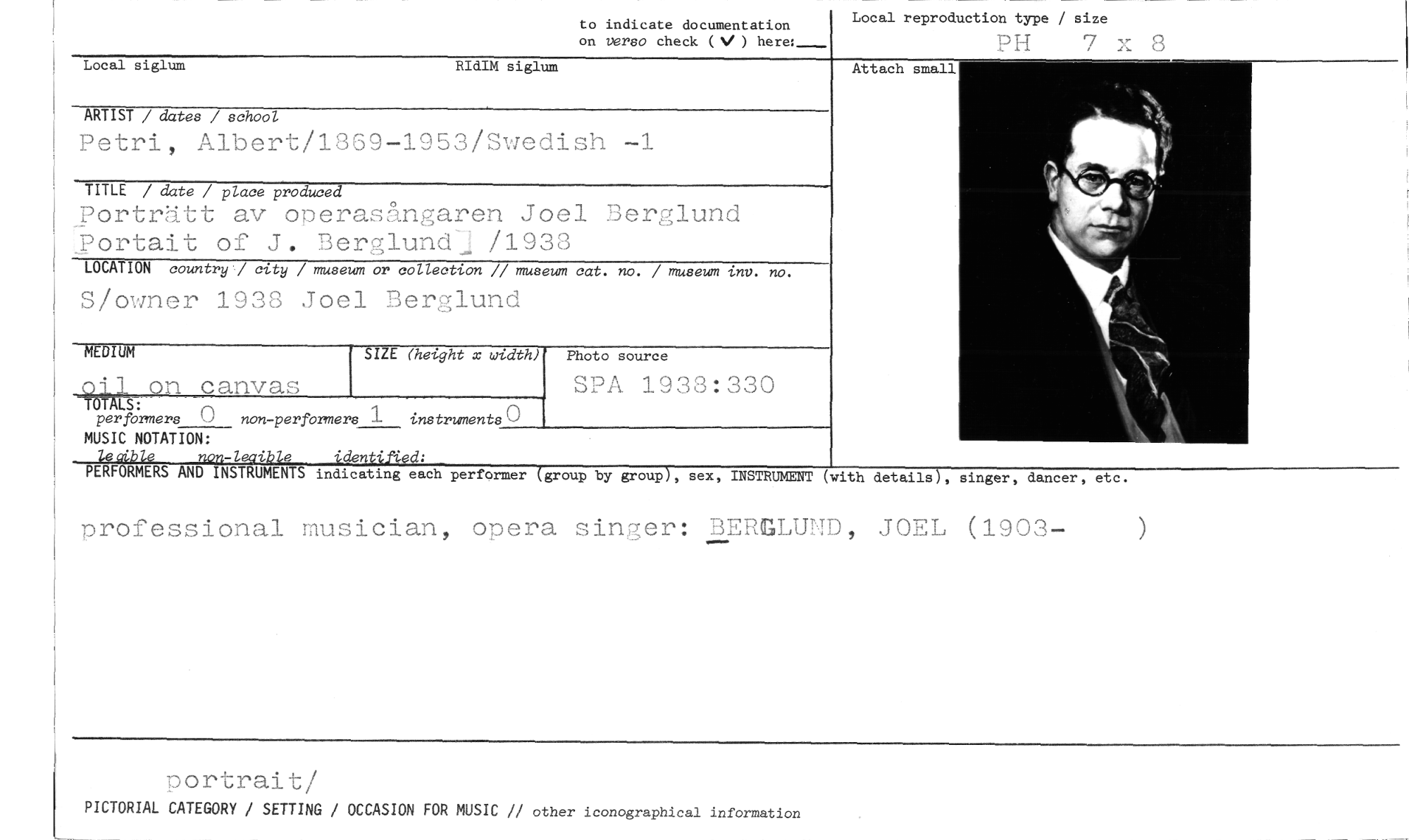 //// to indicate documentation //// on versa check ( ) here:___ //// Local reproduction type / size //// PIT 7 //// Attach small //// Local siglum RIdIM siglum //// ARTIST / dates / school //// Petri, Albert/1869-1953/Swedish -1 //// TITLE / date / place produced //// Porträtt av operasångaren Joel Berglund .Portait of J. Berg lund/1938 //// LOCATION country / city / museum or collection // museum cat. no. / museum inv. no. //// S/owner 1938 Joel Berglund //// MEDIUM SIZE (height x width) //// 4goncanvas per formers C) non-performers 1 k instruments MUSIC NOTATION: //// lecible non-leaible identified: //// PERFORMERS AND INSTRUMENTS //// Photo source //// SPA 1933:330 //// indicating each performer group by group), sex, INSTRUMENT (with details), singer, dancer, etc. //// professional musician, opera singer: BERGLUND, JOEL (1903- //// nortrait/ //// PICTORIAL CATEGORY / SETTING / OCCASION FOR MUSIC // other iconographical information ////