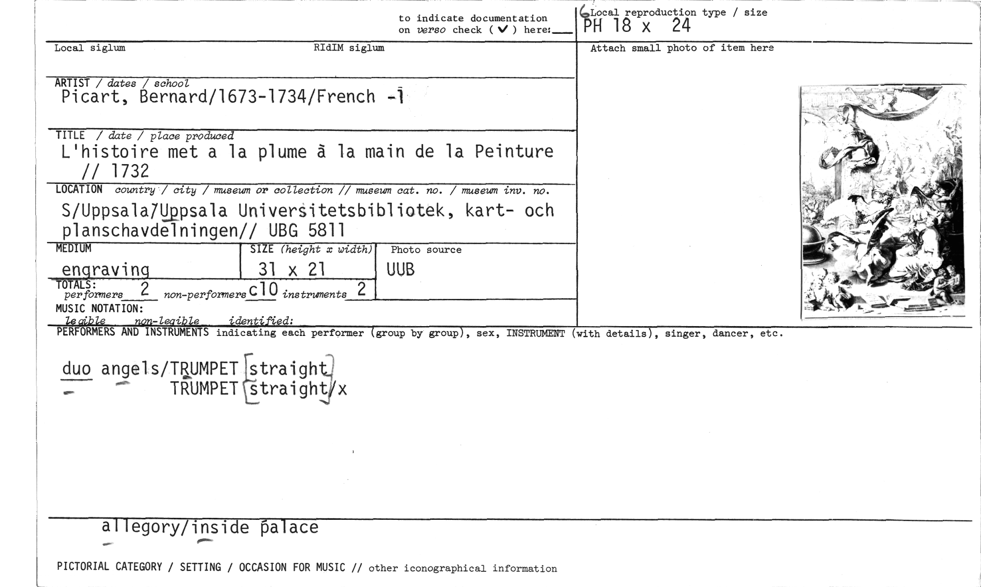 //// to indicate documentation //// on verso check ( V ) here:__-_ //// Local reproduction type / size //// H 18 x 24 //// Local siglum RIdIM siglum //// ARTIST / dates / school //// Picart, Bernard/1673-1734/French -1 //// TITLE / date / place produced //// L'histoire met a la plume å la main de la Peinture // 1732 //// LOCATION country / city / museum or collection // museum cat. no. / museum inv. no. //// S/Uppsala792psala UniverSitetsbibliotek, kart- och planschavdelningen// UBG 5811 //// MEDIUM SIZE (height x width) Photo source //// engrwii no 31 x 21 UUB //// TÖTALS: non-performers C 1 instruments 2 //// per forners 2 //// MUSIC NOTATION: //// non-leaible identified: //// PERFORMERS AND INSTRUMENTS indicating each performer //// duo angels/TRUMPETTstraight4 TRUMPET straightyx //// Attach small photo of item here //// (group by group), sex, INSTRUMENT (with details), singer, dancer, etc. //// allegory/inside Palace //// PICTORIAL CATEGORY / SETTING / OCCASION FOR MUSIC // other iconographical information ////