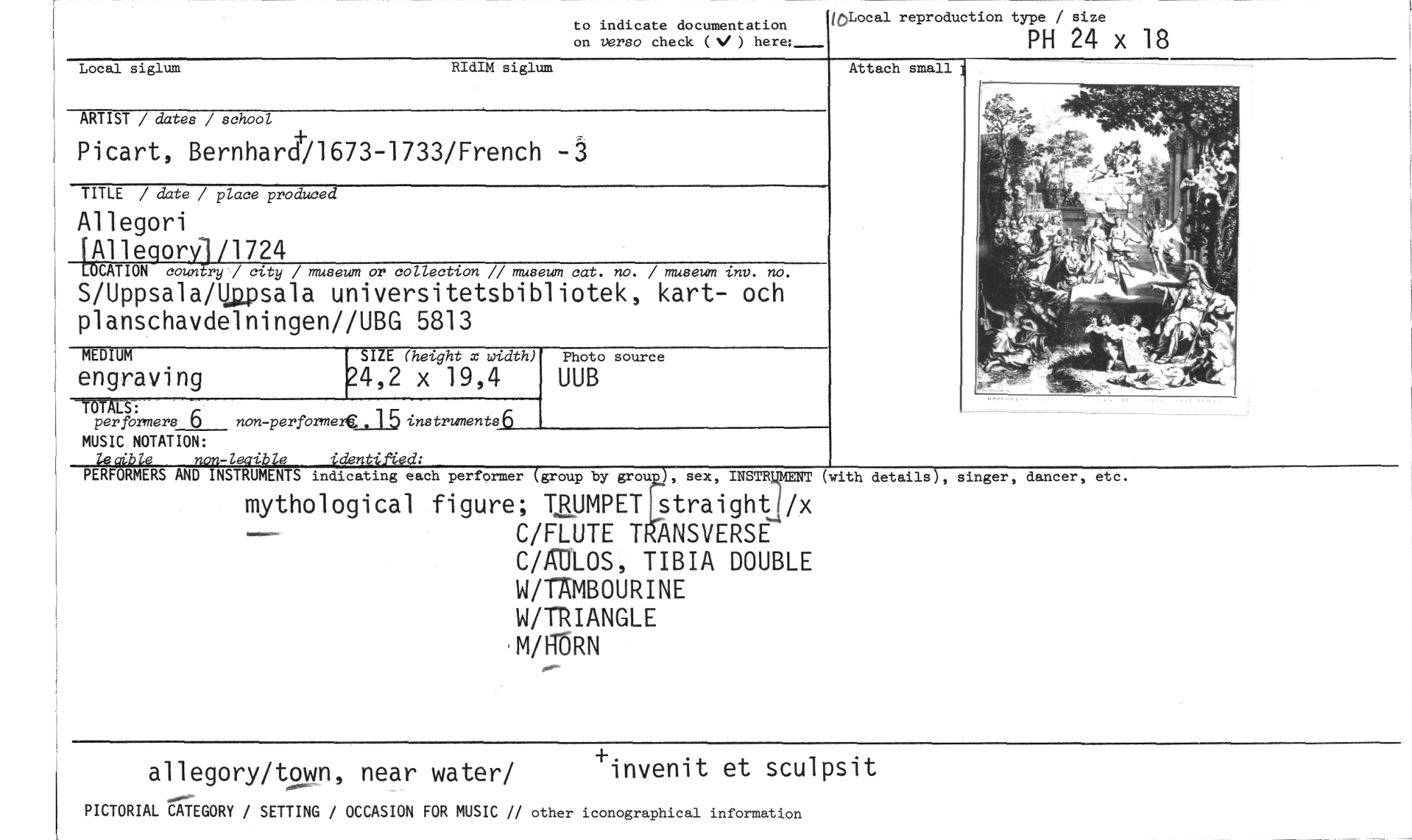 //// to indicate documentation //// on verso check (N/ ) here: __-- //// /OLocal reproduction type / size //// PH 24 x 18 //// Local siglum RIdIM siglum //// Attach small : //// ARTIST / dates / school //// Picart, Bernhar41673-1733/French //// TITLE / date / place produced //// MEDIUM //// engraving //// SIZE (height x width) //// 24,2 x 19,4 //// Photo source //// UUB //// -TÖTALS: //// per formers 6 non-perfermere .1 5 instruments6 //// MUSIC NOTATION: //// lecible non-leaible identifi4d; //// PERFORMERS AND INSTRUMENTS indicating each performer (group by group), sex, INSTRgMENT (with details), singer, dancer, etc. //// mythological figure; TRUMPET straightj/x //// C/FLUTE TKANSVERSE C/ADLOS, TIBIA DOUBLE W/TAMBOURINE //// W/TRIANGLE //// .M/HÖRN //// +invenit et sculpsit //// allegory/town, near water/ //// PICTORIAL CATEGORY / SETTING / OCCASION FOR MUSIC // other iconographical information //// Allegori //// lAllegorA/1724 //// LOCATION country / city / museum or collection // museum cat. no. / museum inv. no. //// S/Uppsala/Upsala universitetsbibliotek, kart- och planschavdelningen//UBG 5813 ////