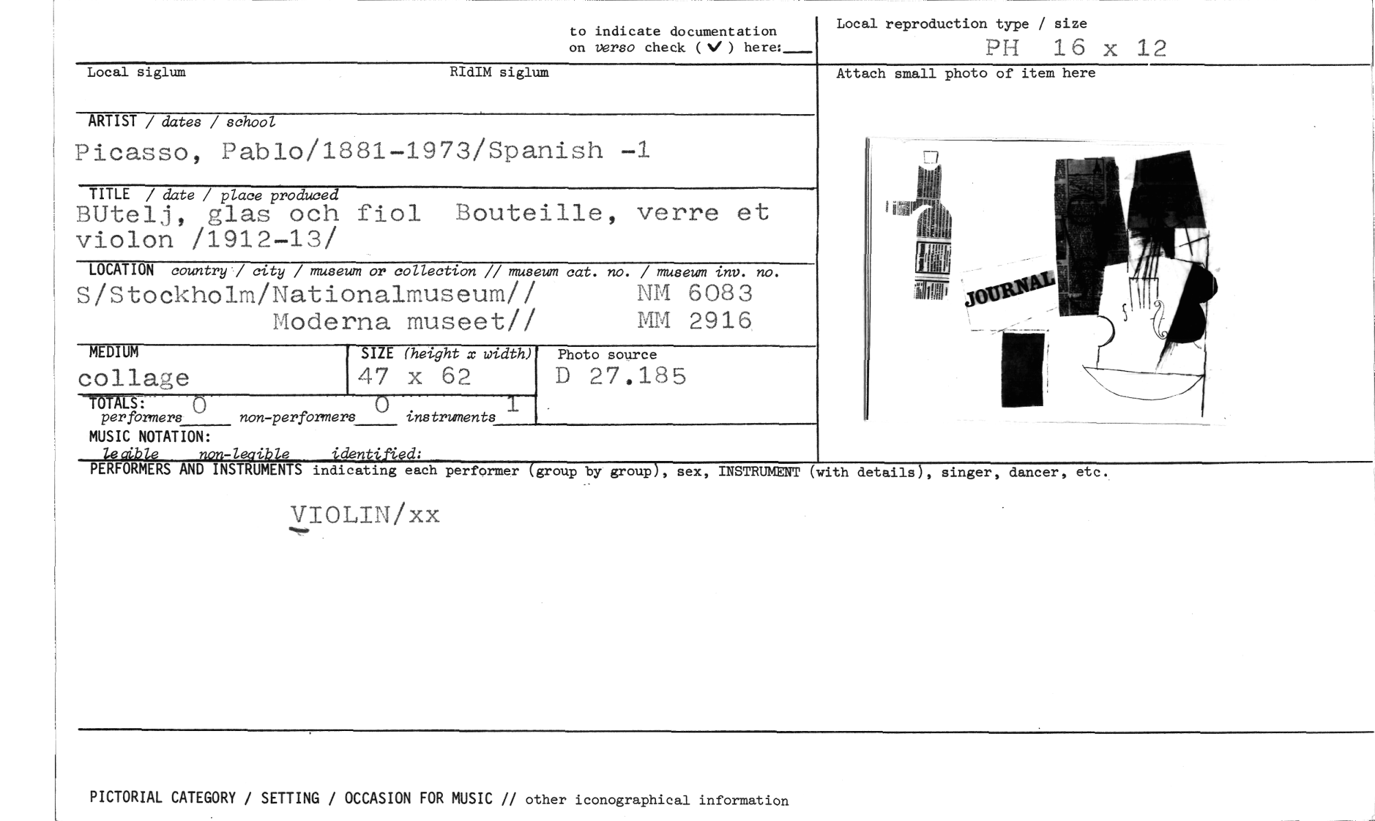 //// to indicate documentation on verso check ( ) //// Local reproduction type / size //// PIS 16 x 12 //// Local siglum RIdIM siglum //// ARTIST / dates / school //// Picasso, Pablo/1881-1973/Spanish -1 //// TITLE / date / place produced //// BUtelj, glas och fiol Bouteille, verre et violon /1912-13/ //// LOCATION country / city / museum or collection // museum cat. no. / museum inv. no. //// S/Stockholm/Nationalmuseum// NM 6083 //// Moderna museet// MM 2916 //// MEDIUM SIZE (height x width) Photo source //// collage 47 x 62 D 27.185 //// TOTALS: 0 () instruments //// per formers non -perfbrmers //// MUSIC NOTATION: //// Attach small photo of item here //// lecible non-leaible identified: //// PERFORMERS AND INSTRUMENTS indicating each performer (group by group), sex, INSTRUMENT //// VIOLIN/xx //// (with details), singer, dancer, etc. //// PICTORIAL CATEGORY / SETTING / OCCASION FOR MUSIC // other iconographical information ////