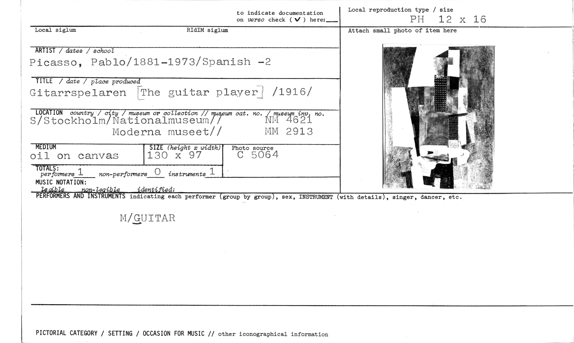 //// to indicate documentation //// on versa check (V ) here:_ //// Local reproduction type / size //// Pil 12 x 16 //// Local siglum RIdIM siglum //// Attach small photo of item here //// ARTIST / dates / school //// Picasso, Pablo/1881-1973/Spanish -2 //// TITLE / date / place produced //// Gitarrspelaren [The guitar plager: /1916/ //// LOCATION country / city / museum or collection //mus,eum cat. no. / muse //// S/Stockholm/Nationalmuseum// NM 621 //// Moderna museet// MM 2913 //// oil on canvas //// MEDIUM //// 130 x 97 //// SIZE (height x width) //// .#•.4-/-•i! e •dent • d; //// PERFORMERS AND INSTRUMENTS indicating each performer group by group , sex, INSTRUMENT (with details , singer, dancer, etc. //// M/GUITAR //// -"Tl5Tlr7r-7 //// per formers //// MUSIC NOTATION: //// non-perfontters 0 instrnenents //// Photo source //// C 5064 //// PICTORIAL CATEGORY / SETTING / OCCASION FOR MUSIC // other iconographical information ////