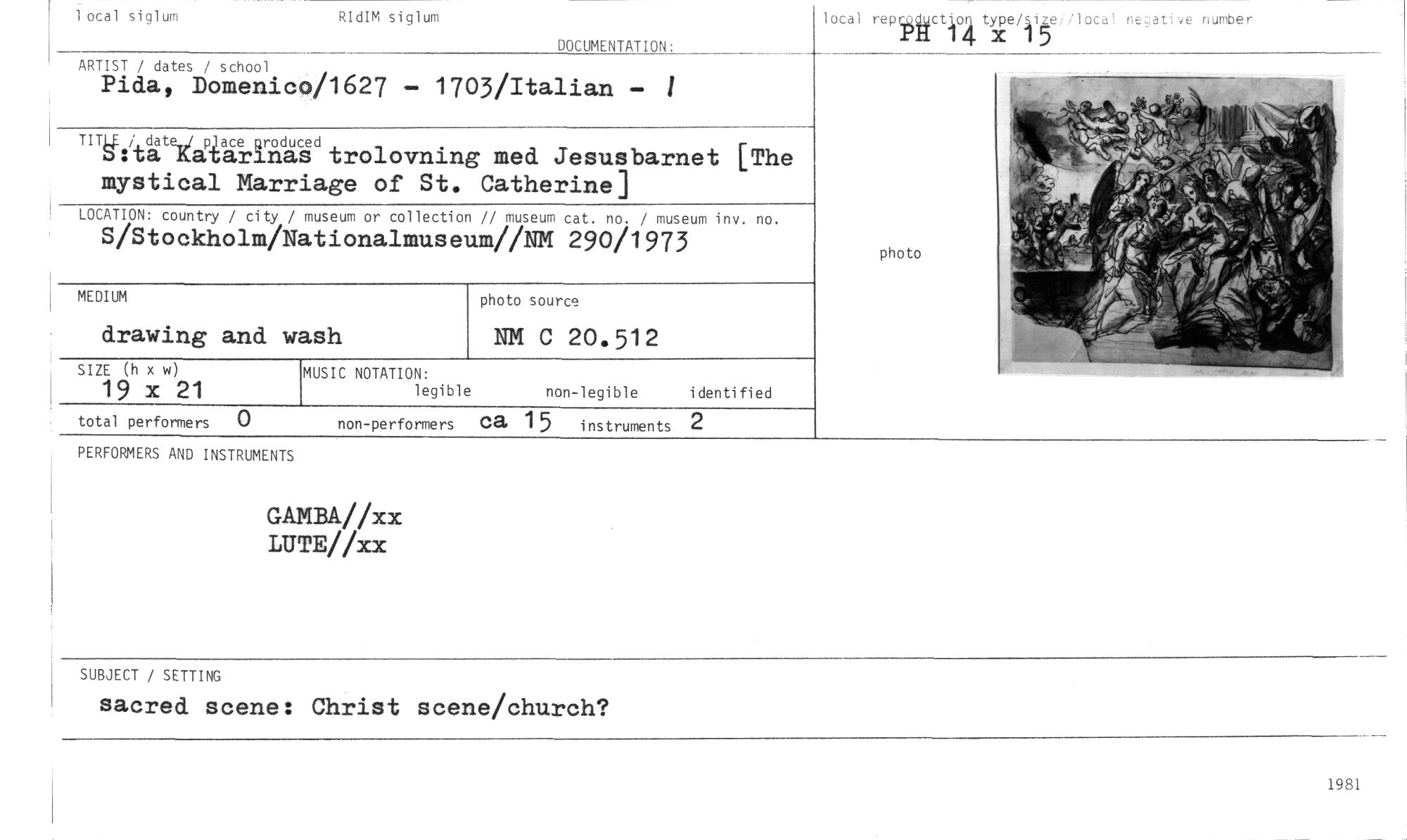 //// SIZE (h x w) //// 19 x 21 //// MUSIC NOTATION: //// legible non-legible identified //// local siglum RIdIM siglum //// DOCUMENTATION: //// ARTIST / dates / school //// Pida, Domenico/1627 - 1703/Italian - I //// TITLE L //// dat pdace roduced //// u:ta atarinas trolovning med Jesusbarnet [The mystical Marriage of St. Catherine] //// LOCATION: country / city / museum or collection // museum cat. no. / museum inv. no. //// S/Stockholm/Nationalmuseum//NM 290/1973 //// MEDIUM //// NN C 20.512 //// local repishctlou tyX ipe/liAe, ilocal negative number //// photo //// photo source //// drawing and wash //// total performers 0 non-performers ca 15 instruments 2 //// PERFORMERS AND INSTRUMENTS //// GAMBA//xx LUTE//xx //// SUBJECT / SETTING //// sacred scene: Christ scene/church? ////