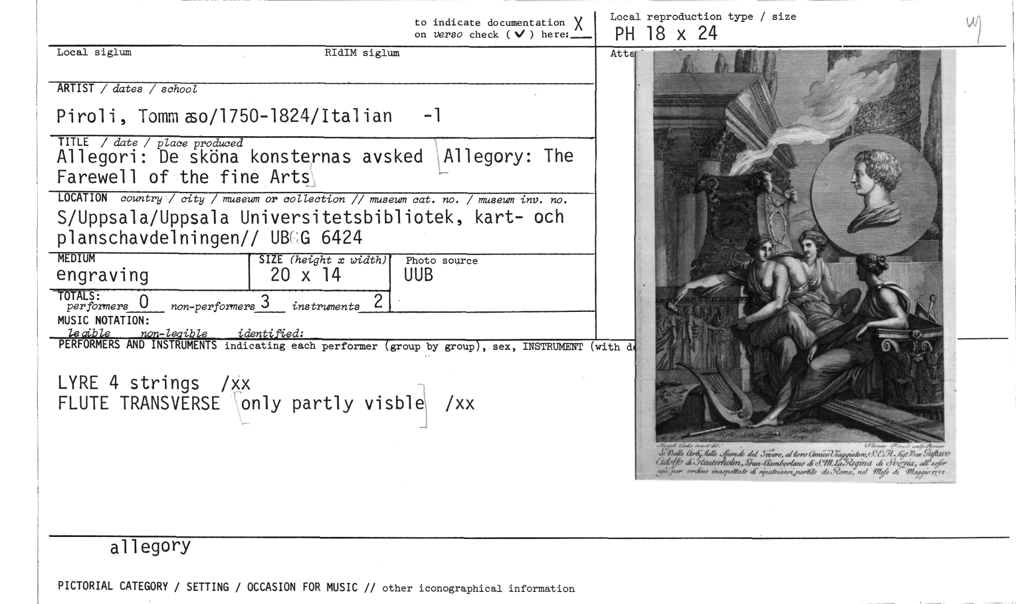 //// to indicate documentation X on versa check ( ) here: Local reproduction type / size //// PH 18 x 24 //// Local siglum RIdIM siglum //// ARTIST / dates / school //// Piroli, Tommiso/1750-1824/Italian -1 //// TITLE / date / place produced //// Allegori: De sköna konsternas avsked Allegory: The Farewell of the fine Arts //// LOCATION country / city / museum or collection // museum cat. no. / museum tnv. no. //// S/Uppsala/Uppsala Universitetsbibliotek, kart- och planschavdelningen// UB(G 6424 //// MEDIUM SIZE (height x width) Photo source //// engraving 20 x 14 UUB //// TOTALS: //// per formers 0 non-performers 3 instruments 2 //// MUSIC NOTATION: //// le db le non-lesible identifrled: //// PERFORMERS AND INSTRUMENTS indicating each performer (group by group), sex, INSTRUMENT (with dg //// LYRE 4 strings /xx //// FLUTE TRANSVERSE only partly visble /xx //// Atte //// 1.»,//, ,-4;4://, r, b h( //// b,,,2A //// 9,54 //// allegorY //// PICTORIAL CATEGORY / SETTING / OCCASION FOR MUSIC // other iconographical information ////