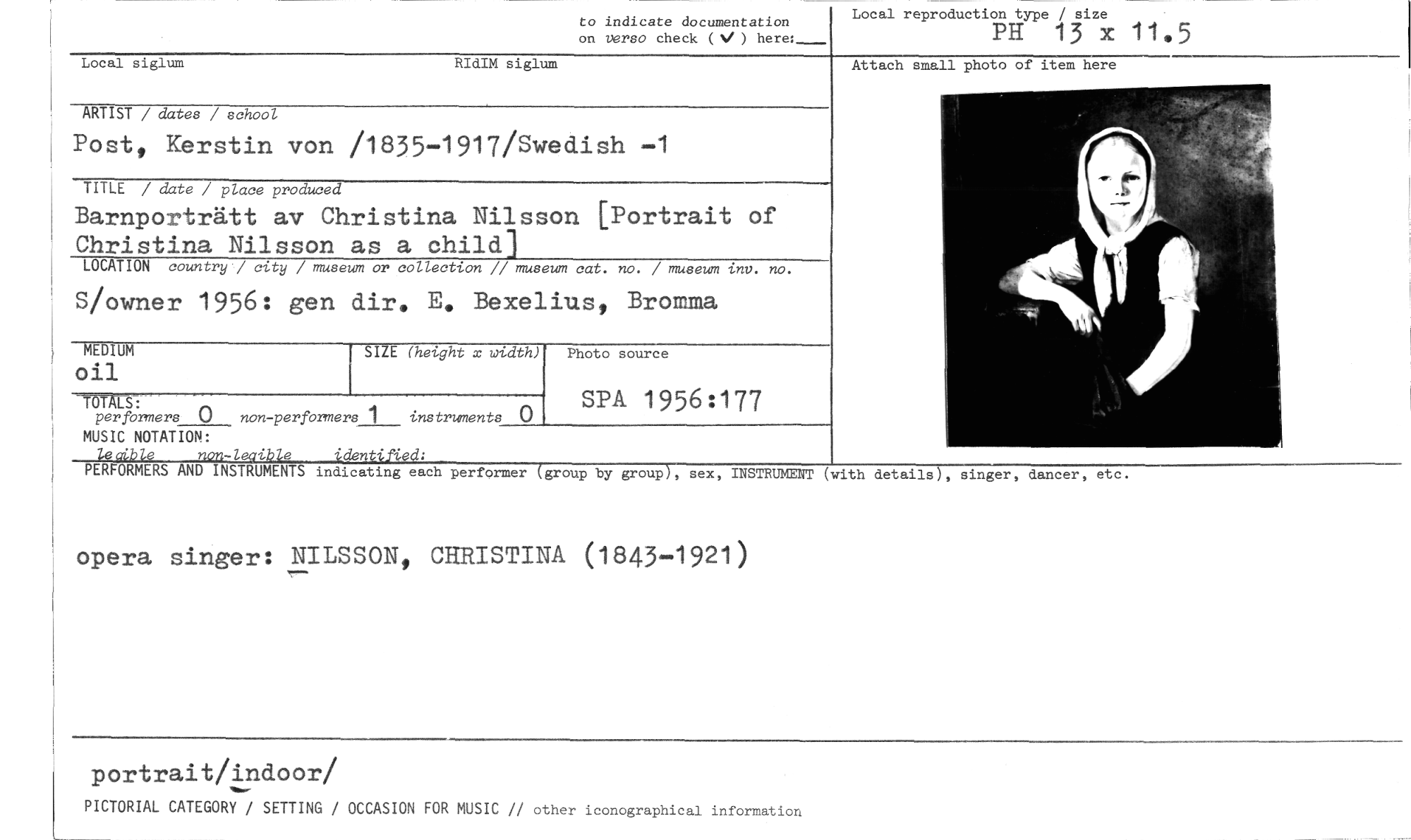 //// to indicate documentation //// on verso check (V ) here:_ //// Local reproduction type / size //// PH 13 x 11.5 //// Local siglum RIdIM siglum //// Attach small photo of item here //// ARTIST / dates / school //// Post, Kerstin von /1835-1917/Swedish —1 //// TITLE / date / place produced //// Barnporträtt av Christina Nilsson [Portrait of Christina Nilsson as a child] //// LOCATION country / city / museum or collection // museum cat. no. / museum inv. no. //// S/owner 1956: gen dir. E. Bexelius, Bromma //// MEDIUM //// oil //// SPA 1956:177 //// MUSIC NOTATION: //// le nlble non-lecible identijied; //// PERFORMERS AND INSTRUMENTS indicating each performer (group by group), sex, //// opera singer: NILSSON, CHRISTINA (1843-1921) //// per formers O non-performers 1 instruments 0 //// SIZE (height x width) Photo source //// dancer, etc. //// INSTRUMENT (with details), singer, //// portrait/indoor/ //// PICTORIAL CATEGORY / SETTING / OCCASION FOR MUSIC // other iconographical information ////