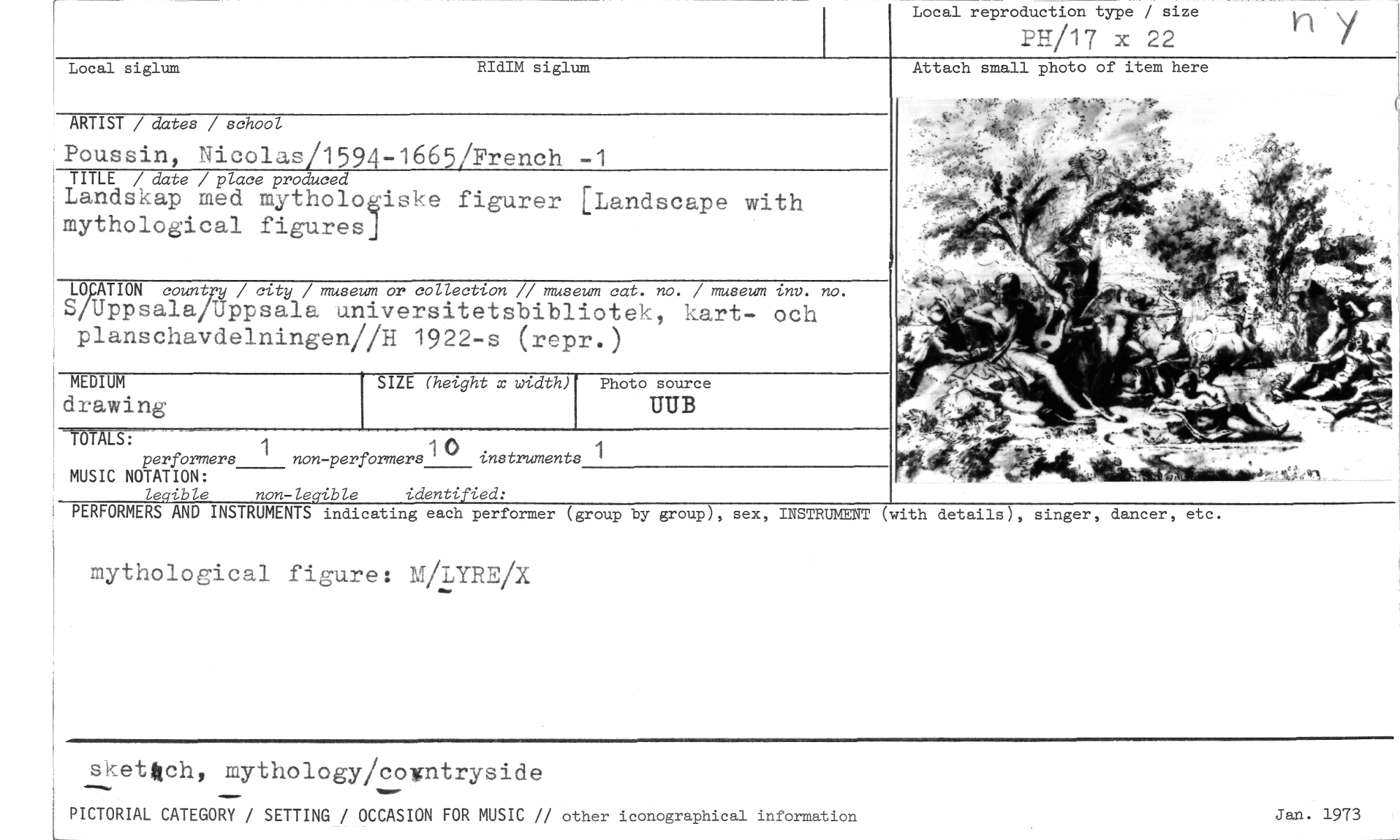 //// (with //// details), singer, dancer, etc. //// Jan. 1973 //// sketftch, mythology/colmtryside //// PICTORIAL CATEGORY / SETTING / OCCASION FOR MUSIC // other iconographical information //// Attach small photo of item here //// Local reproduction type / size //// PIN/17 x 22 //// ri //// ARTIST / dates / school //// Poussin, Nicolas/1594-1665/French -1 //// TITLE / date / place produced //// Landskap med mythologiske figurer [Landscape with mythological figuresj //// LOPATION country / city / museum or collection // museum cat. no. / museum tnv. no. //// S/Uppsala/Uppsala universitetsbibliotek, kart- och planschavdelningen//H 1922-s (repr.) //// drawing UUB //// TETALS: //// 0 //// performers 1 non -performers instruments 1 //// MUSIC NOTATION: //// legible non -legible identified: //// PERFORMERS AND INSTRUMENTS indicating each performer (group by group), sex, INSTRUMENT //// SIZE (height x width) //// MEDIUM Photo source //// Local siglum //// RIdIM siglum //// mythological figure: M/LYRE/X ////