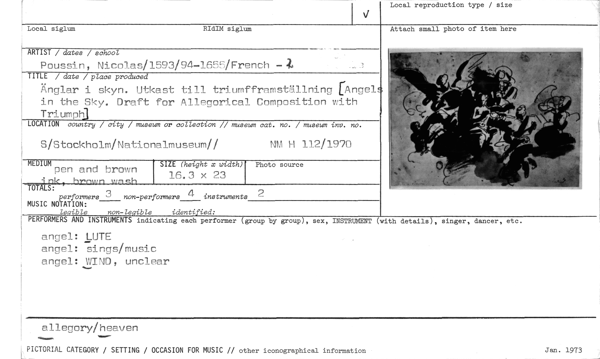 //// allegory/heaven //// PICTORIAL CATEGORY / SETTING / OCCASION FOR MUSIC // other iconographical information Jan. 1973 //// Local reproduction type / size //// Local siglum RIdIM siglum //// ARTIST / dates / school //// Poussin, Nicolas/1593/94-1655/French //// TITLE / date / place produced //// Änglar i skyn. Utkast till triumfframställning [Angel in the Sky. Draft for Allegorical Composition with Triumph] //// LOCATION country / city / museum or collection // museum cat. no. / museum inv. no. //// S/Stockholm/Nationalmuseum// NM H 112/1970 //// Attach small photo of item here //// MEDIUM SIZE (height x width) //// pen and brown inki—Lummahuash 16.3 x 23 //// TOTALS: instruments //// performers 3 non -performers 11" //// MUSIC NOTATION: non -legible identified: //// legible //// Photo source //// 2 //// PERFORMERS AND INSTRUMENTS indicating each performer (group //// angel: LUTE //// angel: sings/music angel: WIND, unclear //// by group), sex, INSTRUMENT (with details), singer, dancer, etc. ////