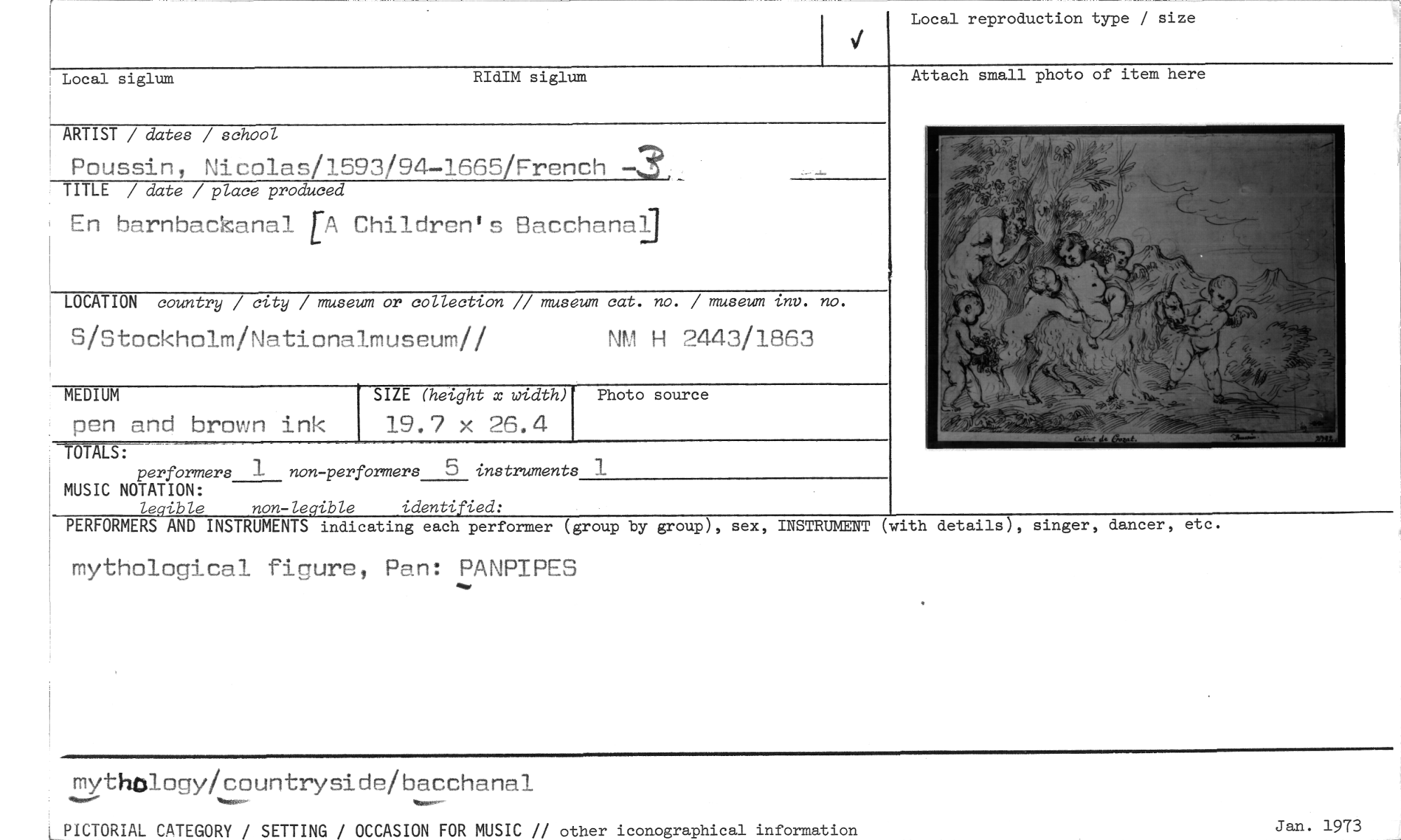 //// Local reproduction type / size //// Attach small photo of item here //// Local sigiun RIdIM siglum //// ARTIST / dates / school //// Poussin, Nicolas/1593/94-1665/French //// TITLE / date / place produced //// En barnbackanal (A Children's Bacchanalj //// LOCATION country / city / museum or collection // museum cat. no. / museum tnv. no. //// S/Stockholm/Nationalmuseum// NM H 2443/1863 //// MEDIUM SIZE (height x width) Photo source //// pen and brown ink 19.7 x 26.4 //// //// performers 1 non -perfbrmers 5 instruments 1 MUSIC NOTATION: //// le•ible non-le•ible identi ied: //// PERFORMERS AND INSTRUMENTS indicating each performer (group by group), sex, INSTRUMENT //// mythological figuro, Pan: PANPIPES //// Wo, //// ith details), singer, dancer, etc. //// mytholony/countryside/bacchanal //// L PICTORIAL CATEGORY / SETTING / OCCASION FOR MUSIC // other iconographical information //// Jan. 1973 ////