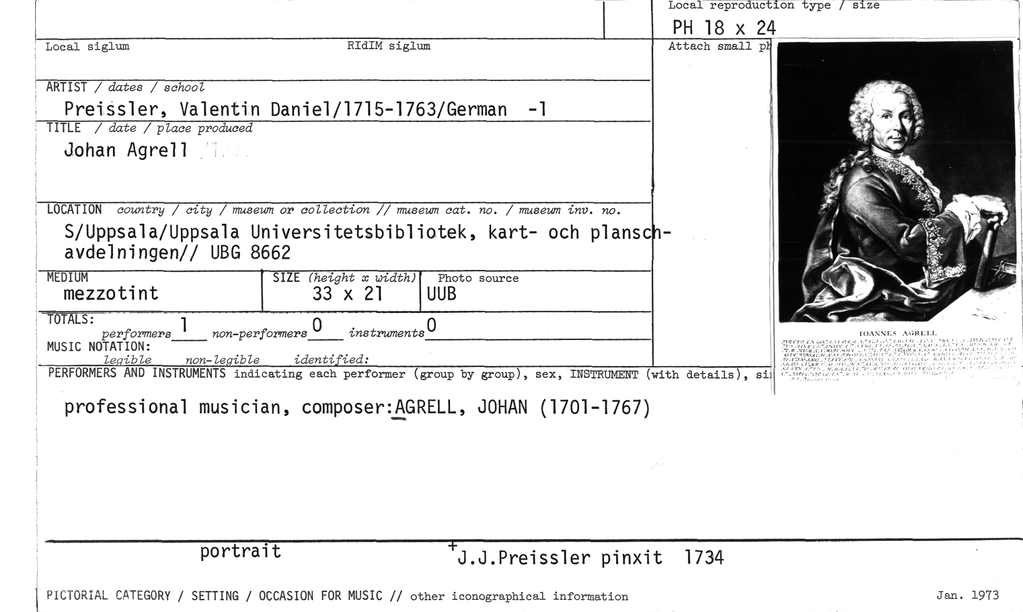 //// professional musician, composer:AGRELL, JOHAN (1701-1767) //// Photo source //// UUB //// MEDIUM //// mezzotint //// SIZE (height x width) //// 33 x 21 //// Local siglum RIdIM siglum //// ARTIST / dates / school //// Preissler, Valentin Daniel/1715-1763/German -1 //// TITLE / date / place produced //// Johan Agrell //// LOCATION country / city / museum or collection // museum cat. no. / museum inc. no. //// Local reproduCtibn type //// PH 18 x 24 //// Attach small pl. //// S/Uppsala/Uppsala Universitetsbibliotek, kart- och planschavdelningen// UBG 8662 //// TOTALS: //// 1 //// performers //// MUSIC NOTATION: //// legible non-legible identified: //// PERFORMERS AND INSTRUMENTS indicating each performer (group by group), sex, INSTRUMENT (with details), si //// • //// non-performers 0 instruments 0 //// portrait +J.J.Preissler pinxit 1734 //// PICTORIAL CATEGORY / SETTING / OCCASION FOR MUSIC // other iconographical information Jan. 1973 ////